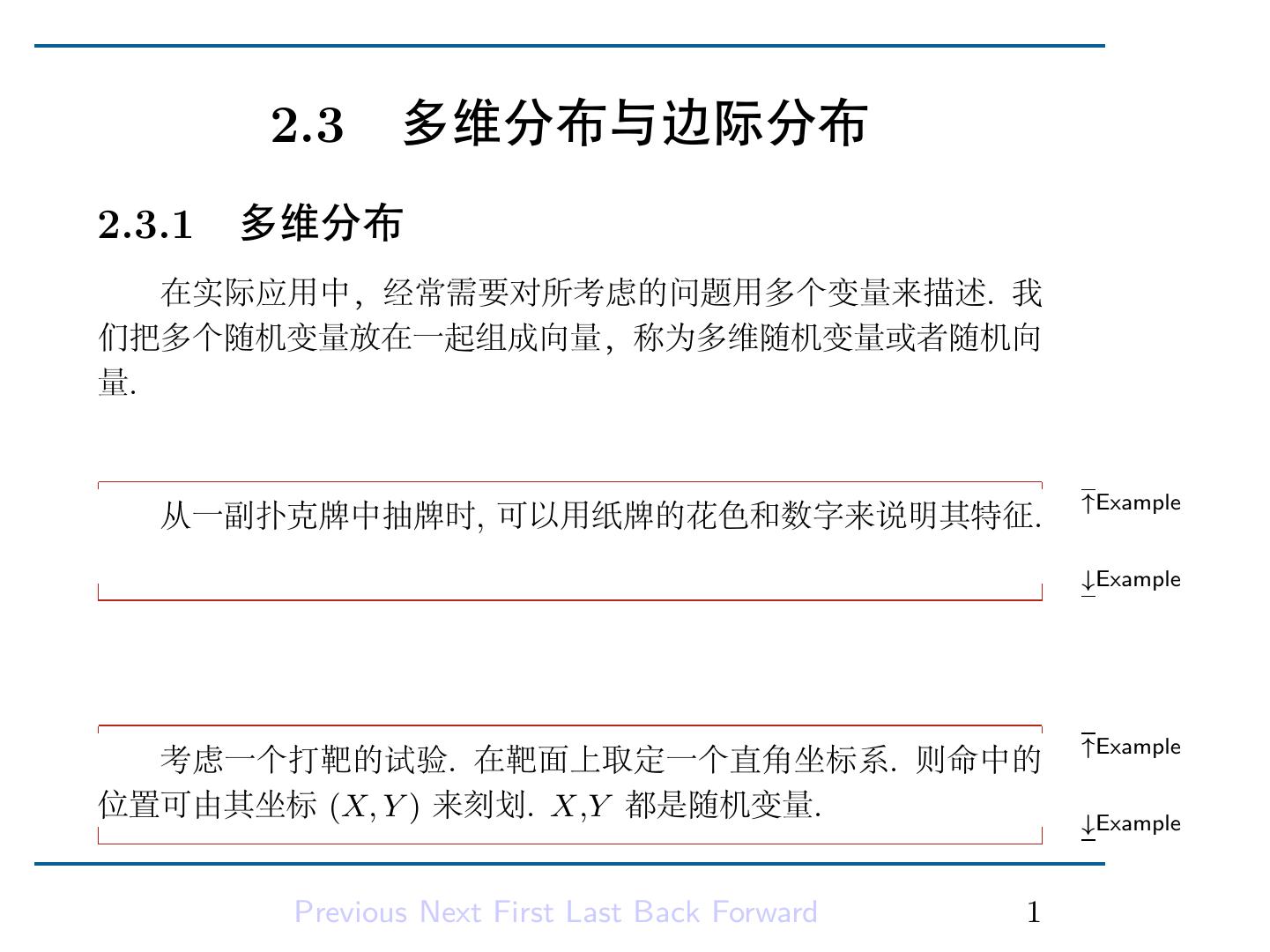 3 . 2.3 多维分布与边际分布 2.3.1 多维分布 在实际应用中,经常需要对所考虑的问题用多个变量来描述. 我 们把多个随机变量放在一起组成向量,称为多维随机变量或者随机向 量. ↑Example 从一副扑克牌中抽牌时, 可以用纸牌的花色和数字来说明其特征. ↓Example ↑Example 考虑一个打靶的试验. 在靶面上取定一个直角坐标系. 则命中的 位置可由其坐标 (X, Y ) 来刻划. X,Y 都是随机变量. ↓Example Previous Next First Last Back Forward 1