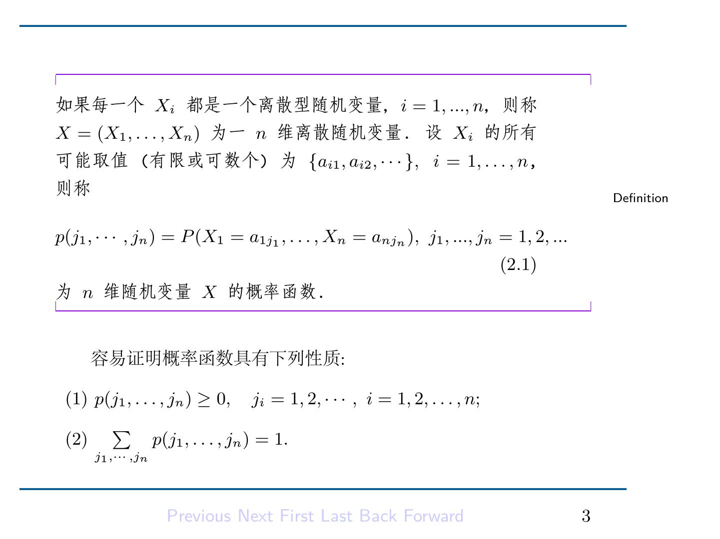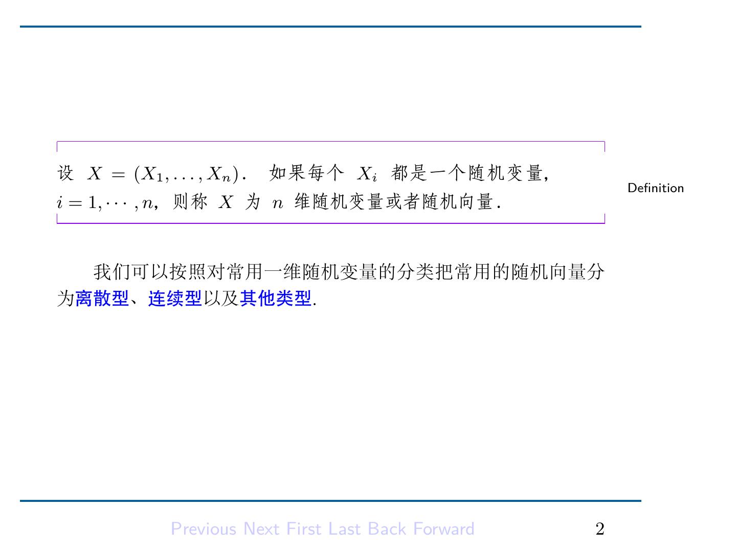 4 .设 X = (X1 , . . . , Xn ). 如果每个 Xi 都是一个随机变量, Definition i = 1, · · · , n,则称 X 为 n 维随机变量或者随机向量. 我们可以按照对常用一维随机变量的分类把常用的随机向量分 为离散型、连续型以及其他类型. Previous Next First Last Back Forward 2