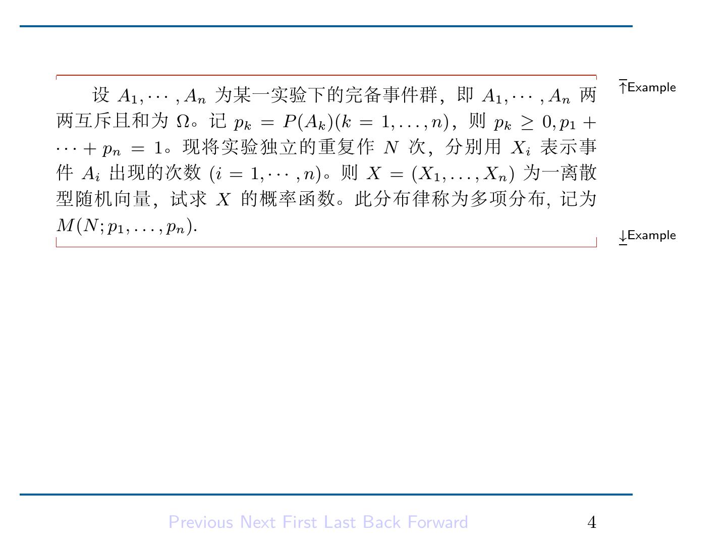 6 . ↑Example 设 A1 , · · · , An 为某一实验下的完备事件群,即 A1 , · · · , An 两 两互斥且和为 Ω。记 pk = P (Ak )(k = 1, . . . , n),则 pk ≥ 0, p1 + · · · + pn = 1。现将实验独立的重复作 N 次,分别用 Xi 表示事 件 Ai 出现的次数 (i = 1, · · · , n)。则 X = (X1 , . . . , Xn ) 为一离散 型随机向量,试求 X 的概率函数。此分布律称为多项分布, 记为 M (N ; p1 , . . . , pn ). ↓Example 解: 由于试验独立进行, 总的结果数为 N ,记结果 Ai 出现的次数为 ki ,则 k1 + · · · + kn = N 。因此相当于多组组合,所以 N! P (X1 = k1 , · · · , Xn = kn ) = P (A1 · · · A1 . . . An · · · An ) k1 ! · · · kn ! N! = pk1 · · · pknn , k1 ! · · · kn ! 1 其中 k1 , . . . , kn 为非负整数且 k1 + · · · + kn = N . Previous Next First Last Back Forward 4