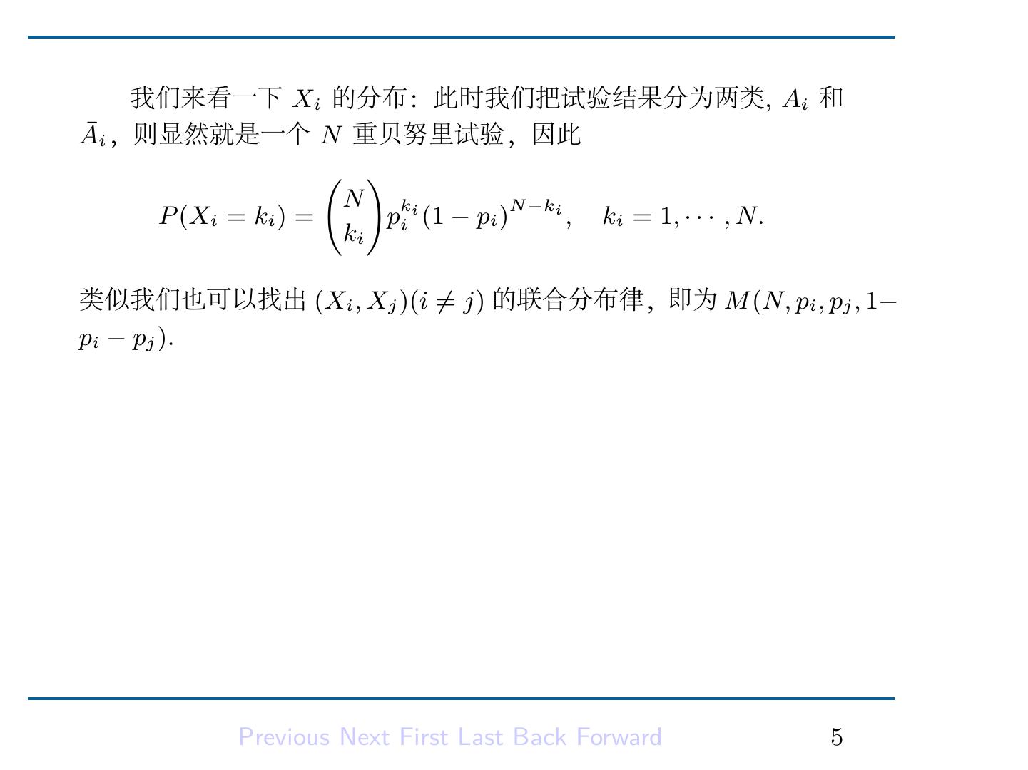 7 . 我们来看一下 Xi 的分布:此时我们把试验结果分为两类, Ai 和 A¯i ,则显然就是一个 N 重贝努里试验,因此 ( ) N ki P (Xi = ki ) = p (1 − pi )N −ki , ki = 1, · · · , N. ki i 类似我们也可以找出 (Xi , Xj )(i ̸= j) 的联合分布律,即为 M (N, pi , pj , 1− pi − pj ). Previous Next First Last Back Forward 5