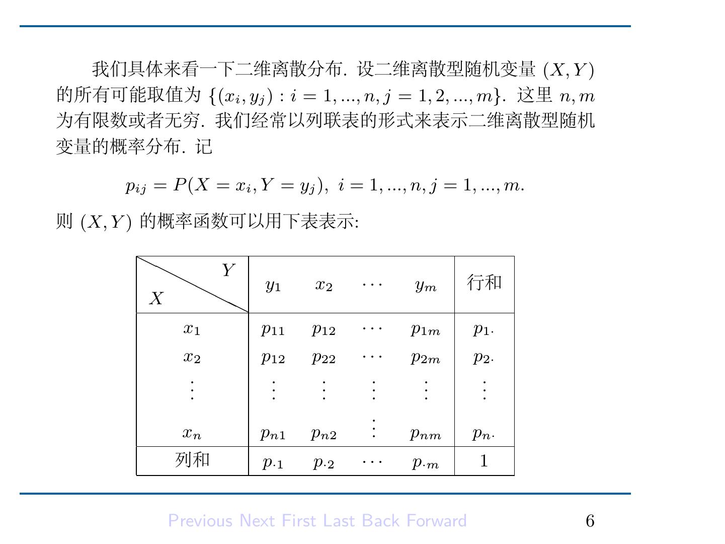 8 . 我们具体来看一下二维离散分布. 设二维离散型随机变量 (X, Y ) 的所有可能取值为 {(xi , yj ) : i = 1, ..., n, j = 1, 2, ..., m}. 这里 n, m 为有限数或者无穷. 我们经常以列联表的形式来表示二维离散型随机 变量的概率分布. 记 pij = P (X = xi , Y = yj ), i = 1, ..., n, j = 1, ..., m. 则 (X, Y ) 的概率函数可以用下表表示: ❍❍ Y ❍❍ y1 x2 ··· ym 行和 X ❍❍ x1 p11 p12 ··· p1m p1· x2 p12 p22 ··· p2m p2· .. .. .. .. .. .. . . . . . . .. xn pn1 pn2 . pnm pn· 列和 p·1 p·2 ··· p·m 1 Previous Next First Last Back Forward 6