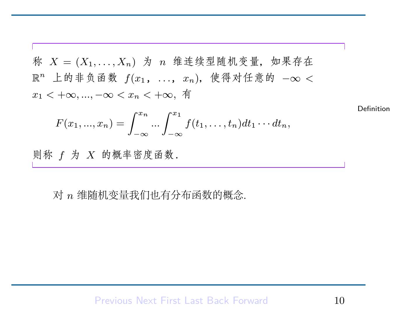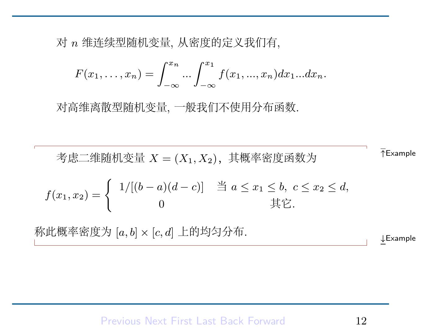 11 .称 X = (X1 , . . . , Xn ) 为 n 维连续型随机变量,如果存在 Rn 上的非负函数 f (x1 , . . ., xn ),使得对任意的 −∞ < a1 ≤ b1 < +∞, ..., −∞ < an ≤ bn < +∞, 有 ∫ bn ∫ b1 Definition P (a1 ≤ X1 ≤ b1 , ..., an ≤ Xn ≤ bn ) = ... f (x1 , . . . , xn )dx1 · · · dxn , an a1 则称 f 为 X 的概率密度函数. Previous Next First Last Back Forward 9