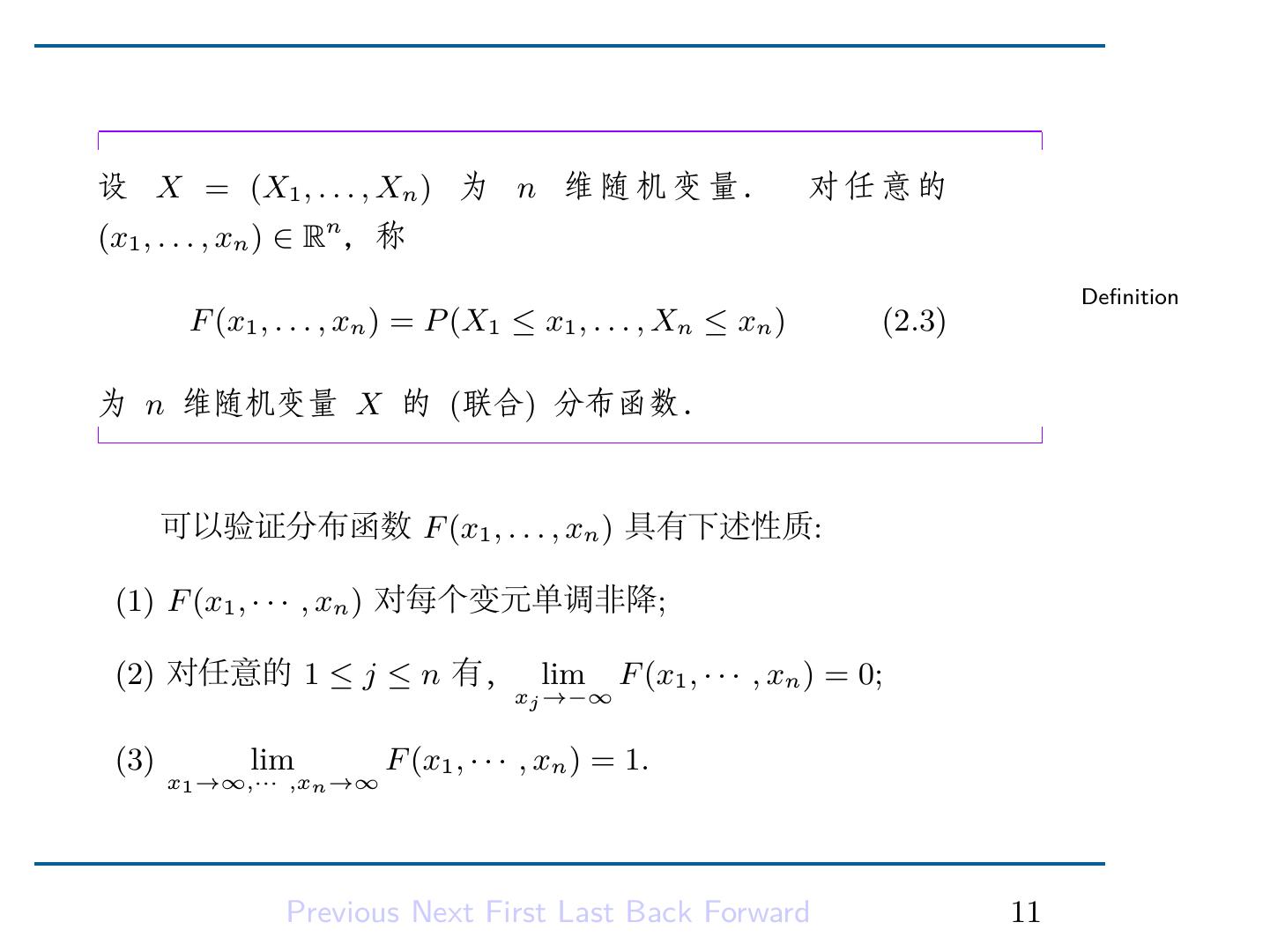 13 .设 X = (X1 , . . . , Xn ) 为 n 维 随 机 变 量. 对任意的 (x1 , . . . , xn ) ∈ Rn ,称 Definition F (x1 , . . . , xn ) = P (X1 ≤ x1 , . . . , Xn ≤ xn ) (2.3) 为 n 维随机变量 X 的 (联合) 分布函数. 可以验证分布函数 F (x1 , . . . , xn ) 具有下述性质: (1) F (x1 , · · · , xn ) 对每个变元单调非降; (2) 对任意的 1 ≤ j ≤ n 有, lim F (x1 , · · · , xn ) = 0; xj →−∞ (3) lim F (x1 , · · · , xn ) = 1. x1 →∞,··· ,xn →∞ Previous Next First Last Back Forward 11