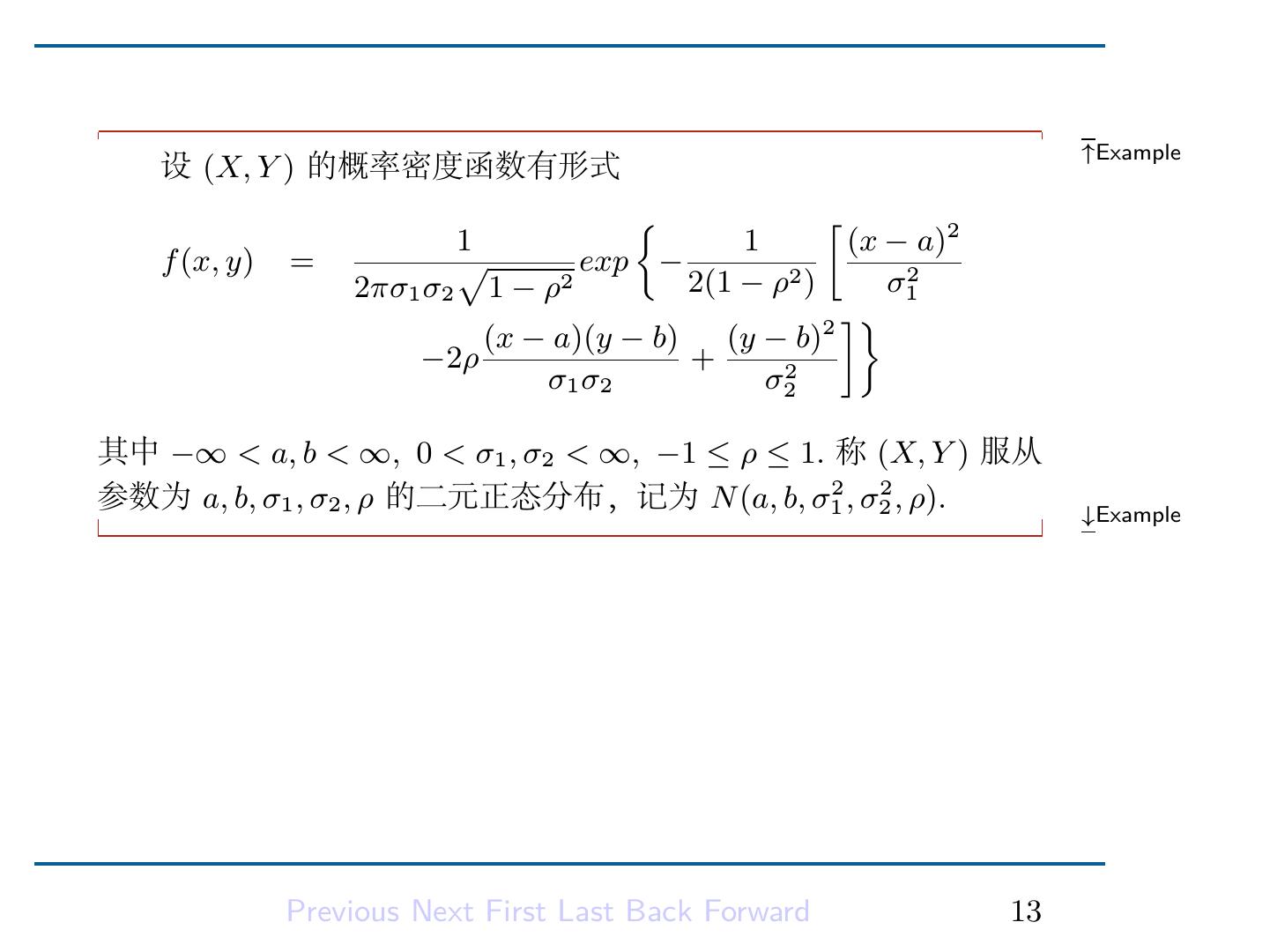 15 . ↑Example 设 (X, Y ) 的概率密度函数有形式 { [ 1 1 (x − a)2 f (x, y) = √ exp − 2πσ1 σ2 1 − ρ2 2(1 − ρ2 ) σ12 ]} (x − a)(y − b) (y − b) 2 −2ρ + σ1 σ2 σ22 其中 −∞ < a, b < ∞, 0 < σ1 , σ2 < ∞, −1 ≤ ρ ≤ 1. 称 (X, Y ) 服从 参数为 a, b, σ1 , σ2 , ρ 的二元正态分布,记为 N (a, b, σ12 , σ22 , ρ). ↓Example Previous Next First Last Back Forward 13