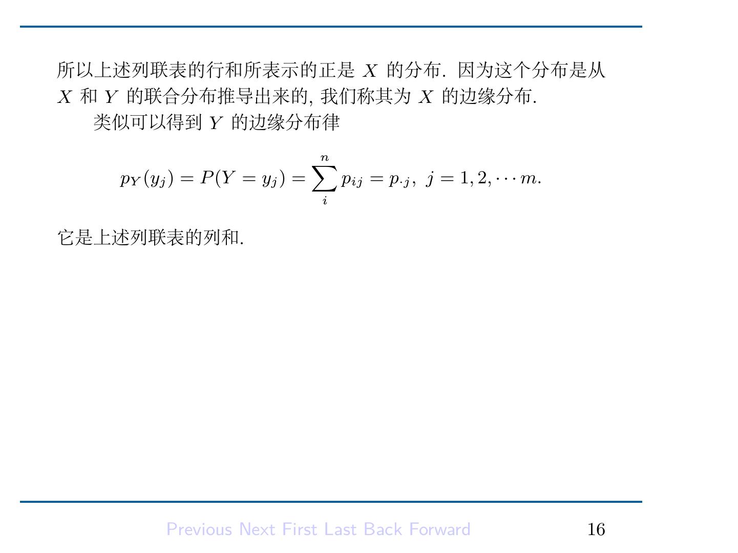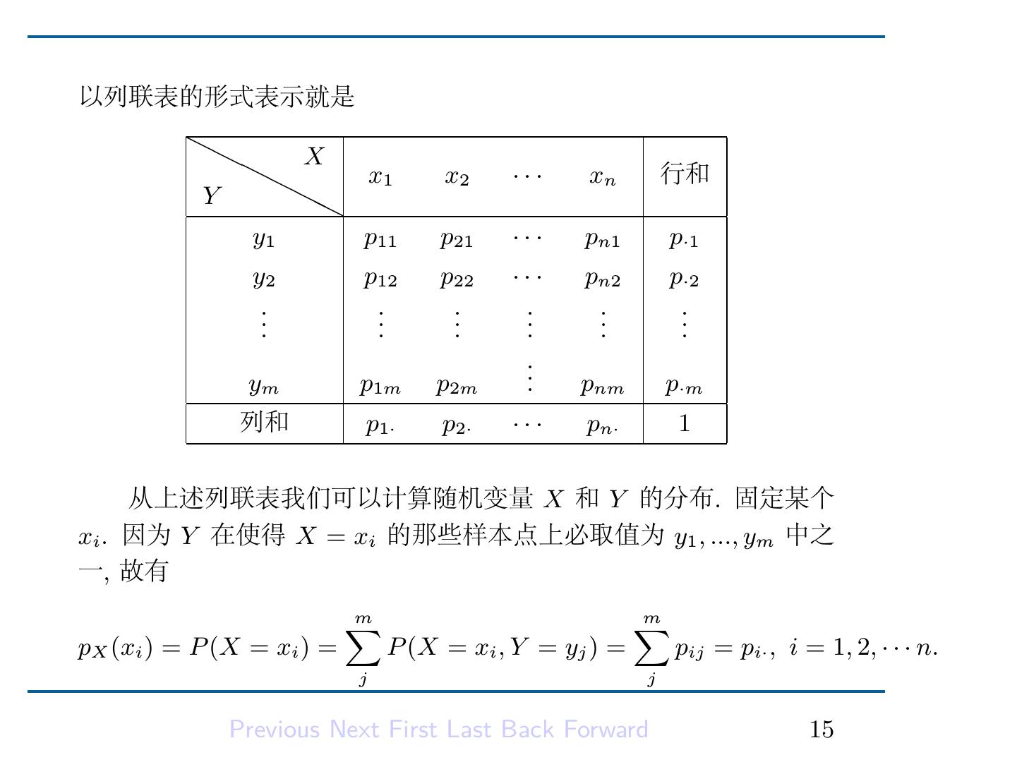 18 .所以上述列联表的行和所表示的正是 X 的分布. 因为这个分布是从 X 和 Y 的联合分布推导出来的, 我们称其为 X 的边缘分布. 类似可以得到 Y 的边缘分布律 ∑ n pY (yj ) = P (Y = yj ) = pij = p·j , j = 1, 2, · · · m. i 它是上述列联表的列和. Previous Next First Last Back Forward 16