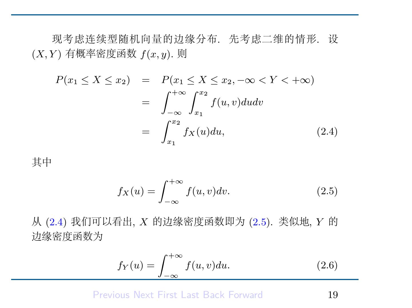 21 . 现考虑连续型随机向量的边缘分布. 先考虑二维的情形. 设 (X, Y ) 有概率密度函数 f (x, y). 则 P (x1 ≤ X ≤ x2 ) = P (x1 ≤ X ≤ x2 , −∞ < Y < +∞) ∫ +∞ ∫ x2 = f (u, v)dudv −∞ x1 ∫ x2 = fX (u)du, (2.4) x1 其中 ∫ +∞ fX (u) = f (u, v)dv. (2.5) −∞ 从 (2.4) 我们可以看出, X 的边缘密度函数即为 (2.5). 类似地, Y 的 边缘密度函数为 ∫ +∞ fY (u) = f (u, v)du. (2.6) −∞ Previous Next First Last Back Forward 19