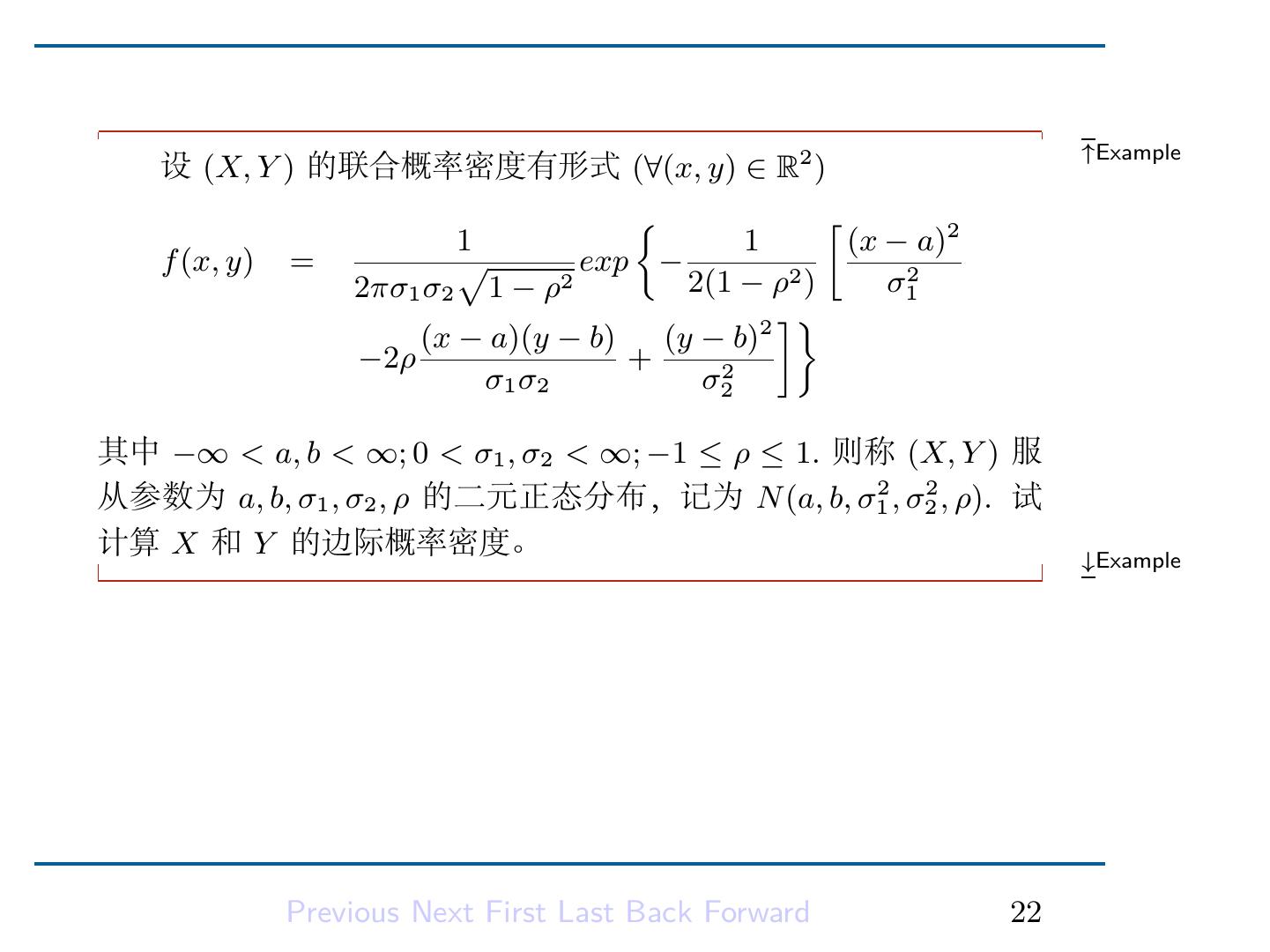 24 . ↑Example 设 (X, Y ) 的联合概率密度有形式 (∀(x, y) ∈ R2 ) { [ 1 1 (x − a)2 f (x, y) = √ exp − 2πσ1 σ2 1 − ρ2 2(1 − ρ2 ) σ12 ]} (x − a)(y − b) (y − b) 2 −2ρ + σ1 σ2 σ22 其中 −∞ < a, b < ∞; 0 < σ1 , σ2 < ∞; −1 ≤ ρ ≤ 1. 则称 (X, Y ) 服 从参数为 a, b, σ1 , σ2 , ρ 的二元正态分布,记为 N (a, b, σ12 , σ22 , ρ). 试 计算 X 和 Y 的边际概率密度。 ↓Example Previous Next First Last Back Forward 22
