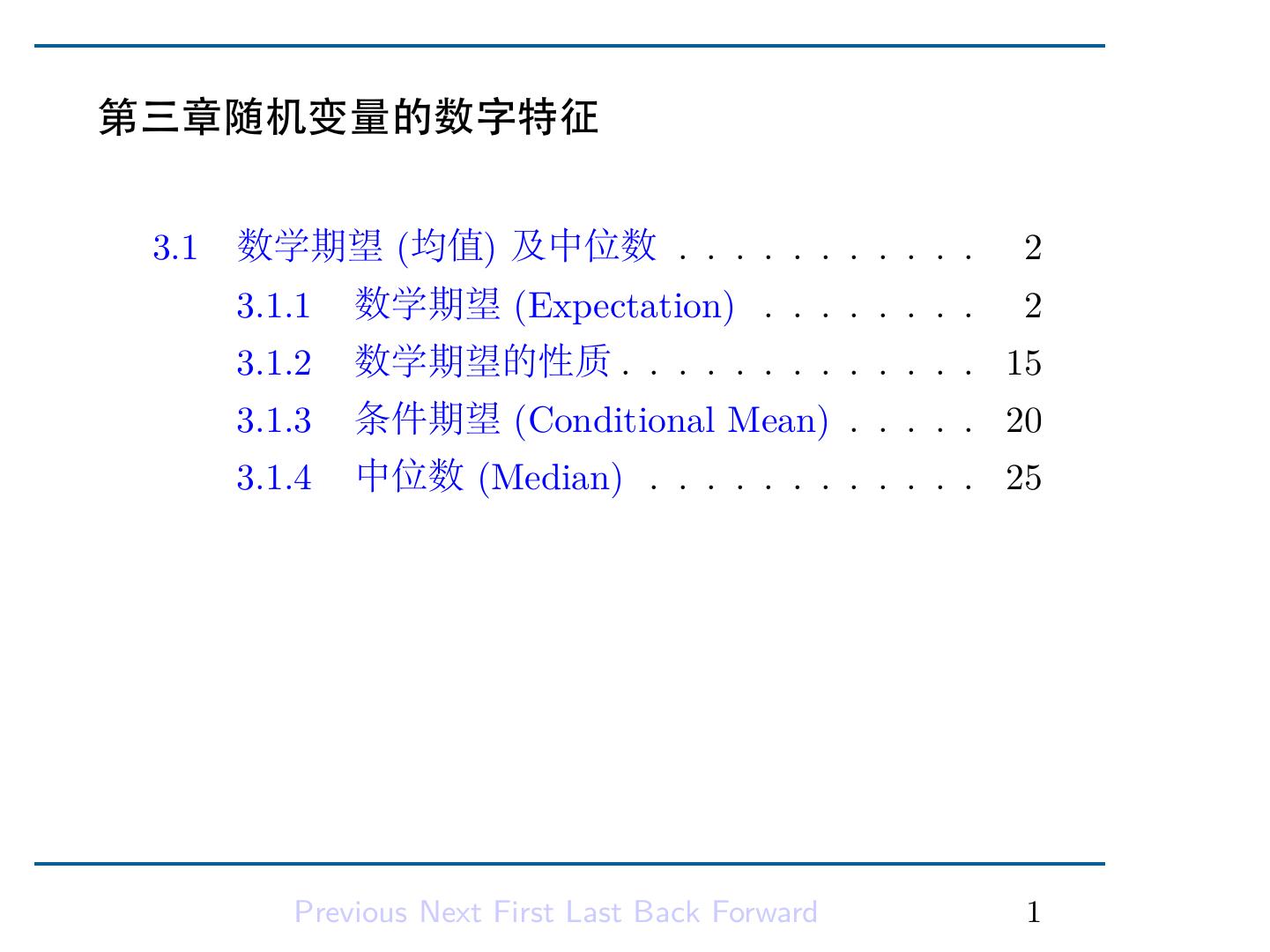 2 .第三章随机变量的数字特征 3.1 数学期望 (均值) 及中位数 . . . . . . . . . . . 2 3.1.1 数学期望 (Expectation) . . . . . . . . 2 3.1.2 数学期望的性质 . . . . . . . . . . . . . 15 3.1.3 条件期望 (Conditional Mean) . . . . . 20 3.1.4 中位数 (Median) . . . . . . . . . . . . 25 Previous Next First Last Back Forward 1
