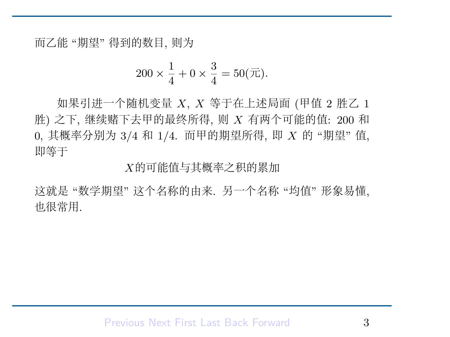 5 .而乙能 “期望” 得到的数目, 则为 1 3 200 × + 0 × = 50(元). 4 4 如果引进一个随机变量 X, X 等于在上述局面 (甲值 2 胜乙 1 胜) 之下, 继续赌下去甲的最终所得, 则 X 有两个可能的值: 200 和 0, 其概率分别为 3/4 和 1/4. 而甲的期望所得, 即 X 的 “期望” 值, 即等于 X的可能值与其概率之积的累加 这就是 “数学期望” 这个名称的由来. 另一个名称 “均值” 形象易懂, 也很常用. Previous Next First Last Back Forward 3