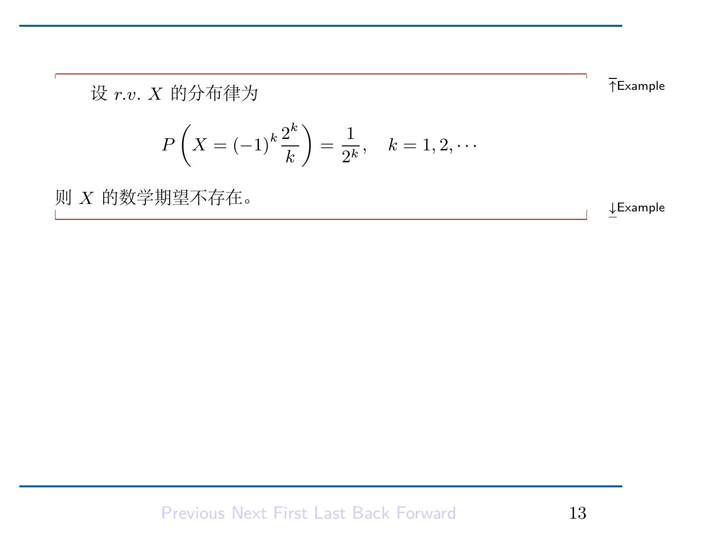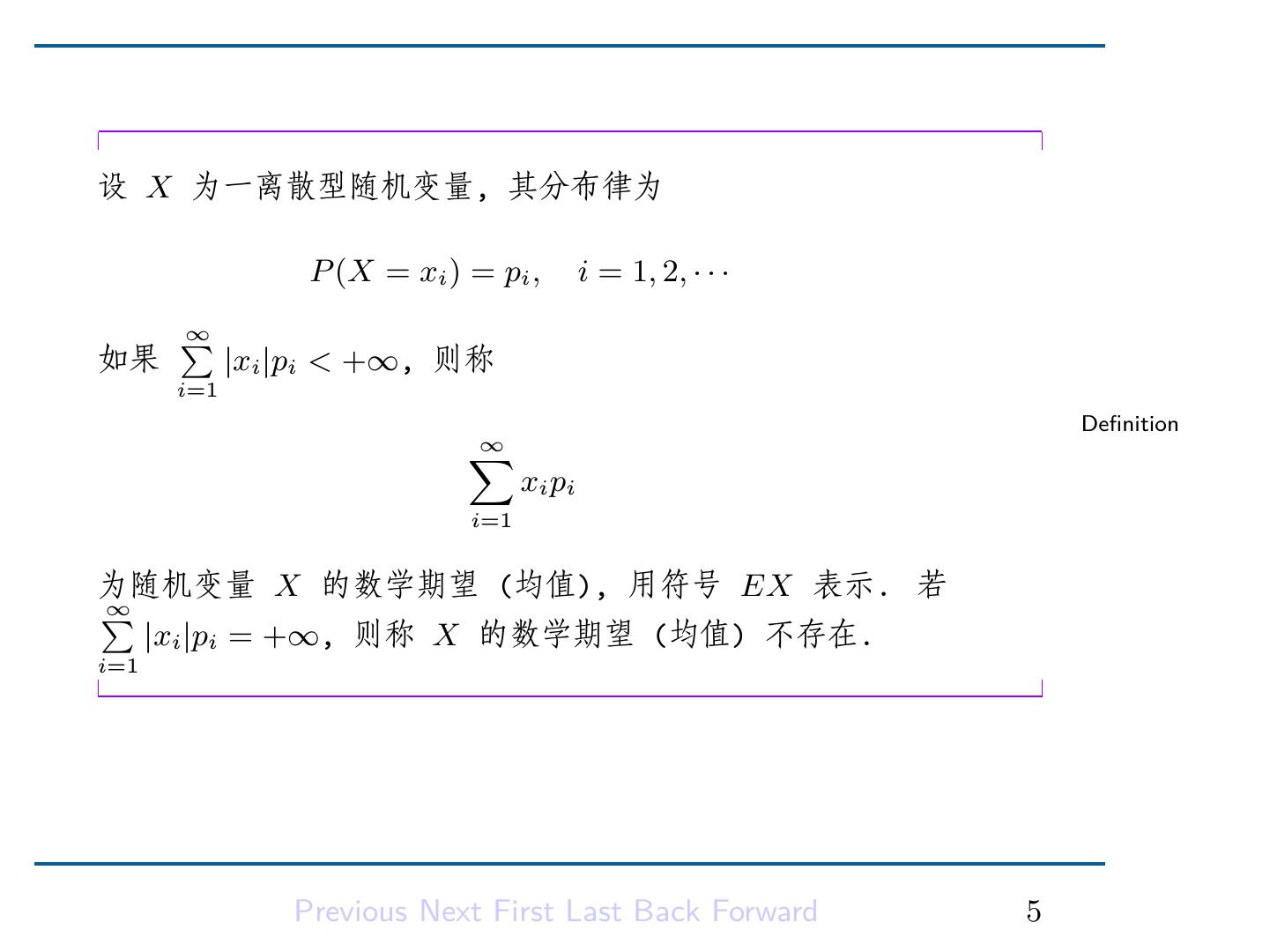 7 .设 X 为一离散型随机变量, 其分布律为 P (X = xi ) = pi , i = 1, 2, · · · ∑ ∞ 如果 |xi |pi < +∞, 则称 i=1 Definition ∑ ∞ xi pi i=1 为随机变量 X 的数学期望 (均值), 用符号 EX 表示. 若 ∑ ∞ |xi |pi = +∞, 则称 X 的数学期望 (均值) 不存在. i=1 Previous Next First Last Back Forward 5