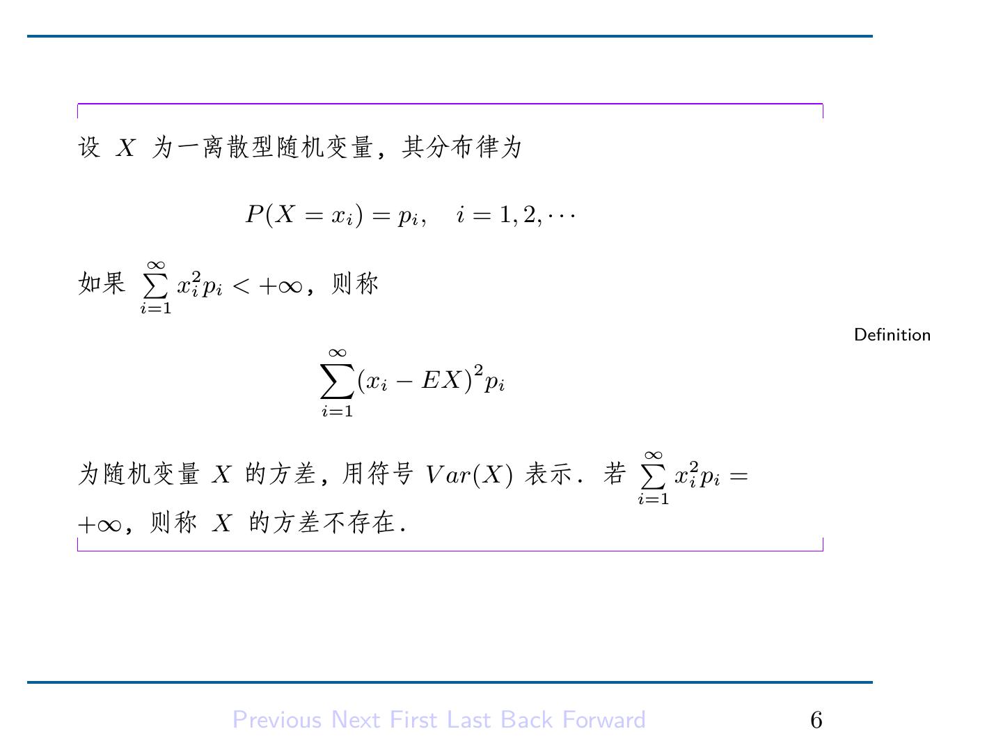 8 .设 X 为一离散型随机变量, 其分布律为 P (X = xi ) = pi , i = 1, 2, · · · ∑ ∞ 如果 x2i pi < +∞, 则称 i=1 Definition ∑ ∞ (xi − EX)2 pi i=1 ∑ ∞ 为随机变量 X 的方差, 用符号 V ar(X) 表示. 若 x2i pi = i=1 +∞, 则称 X 的方差不存在. Previous Next First Last Back Forward 6