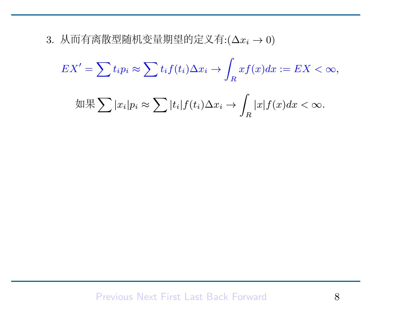 10 .3. 从而有离散型随机变量期望的定义有:(∆xi → 0) ∑ ∑ ∫ EX ′ = ti pi ≈ ti f (ti )∆xi → xf (x)dx := EX < ∞, R ∑ ∑ ∫ 如果 |xi |pi ≈ |ti |f (ti )∆xi → |x|f (x)dx < ∞. R Previous Next First Last Back Forward 8