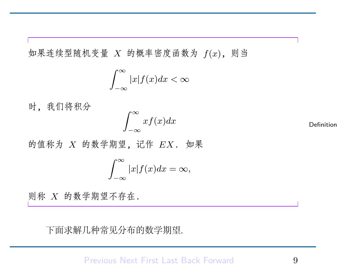 11 .如果连续型随机变量 X 的概率密度函数为 f (x), 则当 ∫ ∞ |x|f (x)dx < ∞ −∞ 时, 我们将积分 ∫ ∞ xf (x)dx Definition −∞ 的值称为 X 的数学期望, 记作 EX. 如果 ∫ ∞ |x|f (x)dx = ∞, −∞ 则称 X 的数学期望不存在. 下面求解几种常见分布的数学期望. Previous Next First Last Back Forward 9