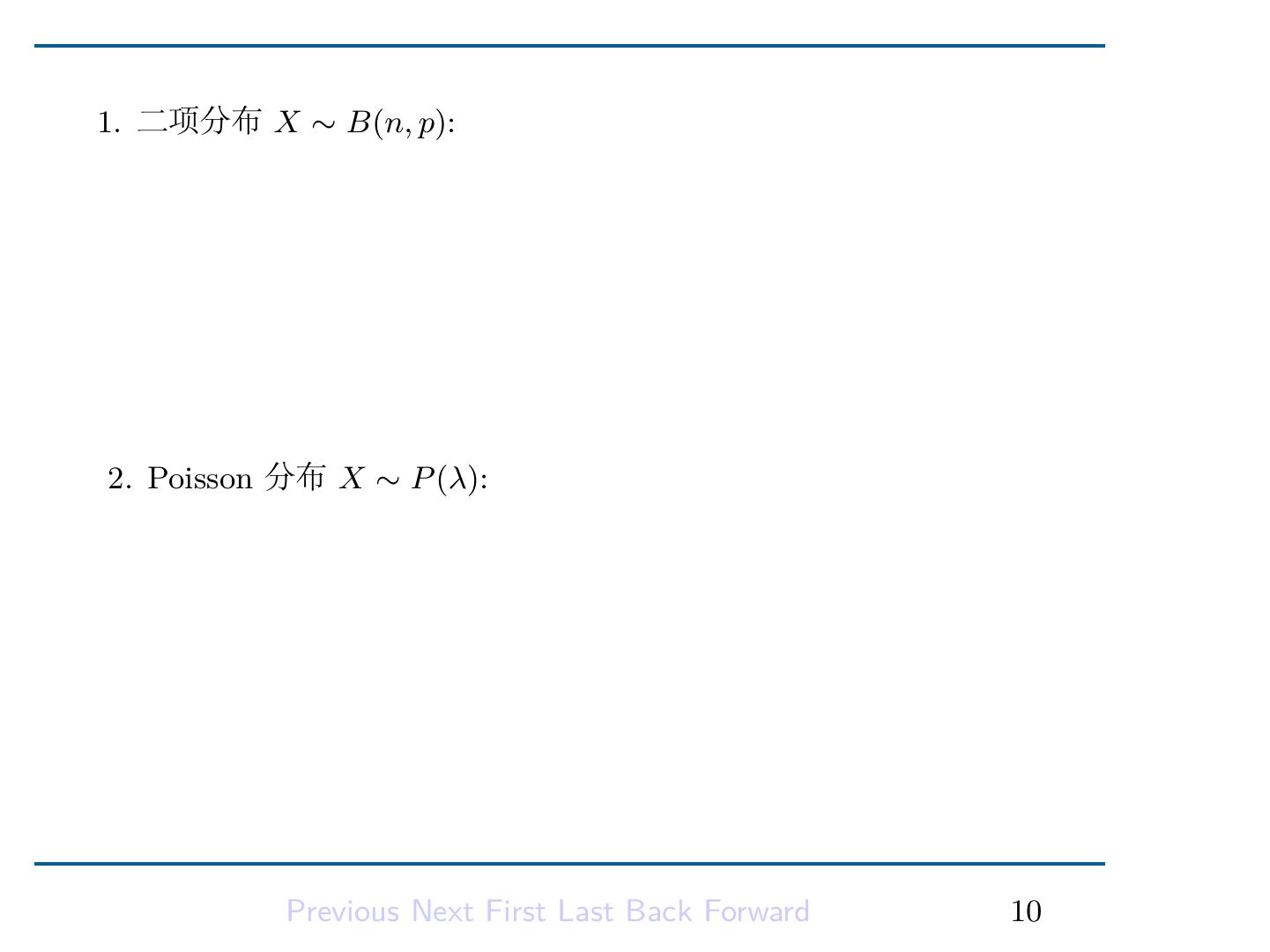12 .1. 二项分布 X ∼ B(n, p): ∑ n n! EX = k. pk (1 − p)n−k k=0 k!(n − k)! ∑ n−1 (n − 1)! = np · pi (1 − p)n−1−i i=0 i!(n − 1 − i)! = np. 2. Poisson 分布 X ∼ P (λ): EX = λ. Previous Next First Last Back Forward 10