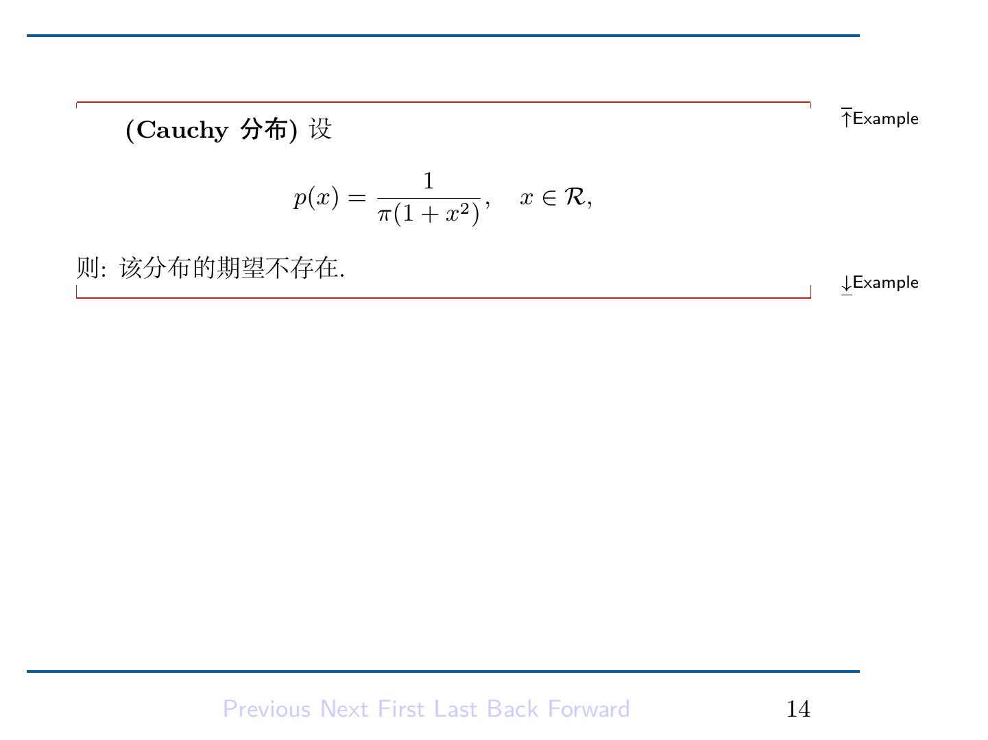 16 . ↑Example (Cauchy 分布) 设 1 p(x) = , x ∈ R, π(1 + x2 ) 则: 该分布的期望不存在. ↓Example 解: 容易看出,p(x) 非负, 并且 ∫ ∞ ∫ 1 ∞ 1 1 p(x)dx = 2 dx = arctan x |∞ −∞ = 1, −∞ π −∞ 1 + x π 所以 p(x) 是一个密度函数 (称为 Cauchy 分布), 但是 ∫ ∞ ∫ 2 ∞ x |x|p(x)dx = dx = ∞, −∞ π 0 1 + x2 所以 Cauchy 分布的期望不存在. # Previous Next First Last Back Forward 14