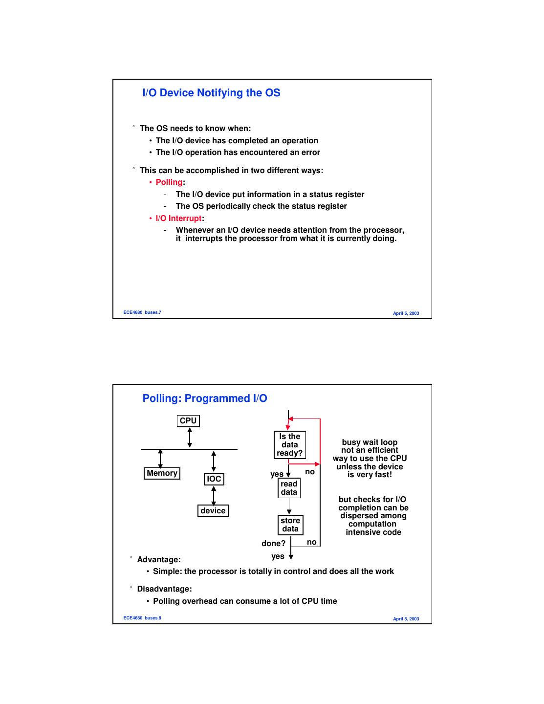 4 . I/O Device Notifying the OS °The OS needs to know when: • The I/O device has completed an operation • The I/O operation has encountered an error °This can be accomplished in two different ways: • Polling: - The I/O device put information in a status register - The OS periodically check the status register • I/O Interrupt: - Whenever an I/O device needs attention from the processor, it interrupts the processor from what it is currently doing. ECE4680 buses.7 April 5, 2003 Polling: Programmed I/O CPU Is the data busy wait loop ready? not an efficient way to use the CPU unless the device Memory yes no is very fast! IOC read data but checks for I/O device completion can be dispersed among store computation data intensive code done? no °Advantage: yes • Simple: the processor is totally in control and does all the work °Disadvantage: • Polling overhead can consume a lot of CPU time ECE4680 buses.8 April 5, 2003
