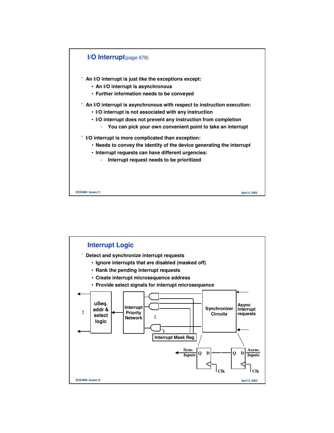 6 . I/O Interrupt(page 678) °An I/O interrupt is just like the exceptions except: • An I/O interrupt is asynchronous • Further information needs to be conveyed °An I/O interrupt is asynchronous with respect to instruction execution: • I/O interrupt is not associated with any instruction • I/O interrupt does not prevent any instruction from completion - You can pick your own convenient point to take an interrupt °I/O interrupt is more complicated than exception: • Needs to convey the identity of the device generating the interrupt • Interrupt requests can have different urgencies: - Interrupt request needs to be prioritized ECE4680 buses.11 April 5, 2003 Interrupt Logic °Detect and synchronize interrupt requests • Ignore interrupts that are disabled (masked off) • Rank the pending interrupt requests • Create interrupt microsequence address • Provide select signals for interrupt microsequence uSeq. Async Interrupt Synchronizer interrupt addr & : Priority Circuits requests select Network : logic Interrupt Mask Reg Sync. Async. Inputs Q D Q D Inputs Clk Clk ECE4680 buses.12 April 5, 2003