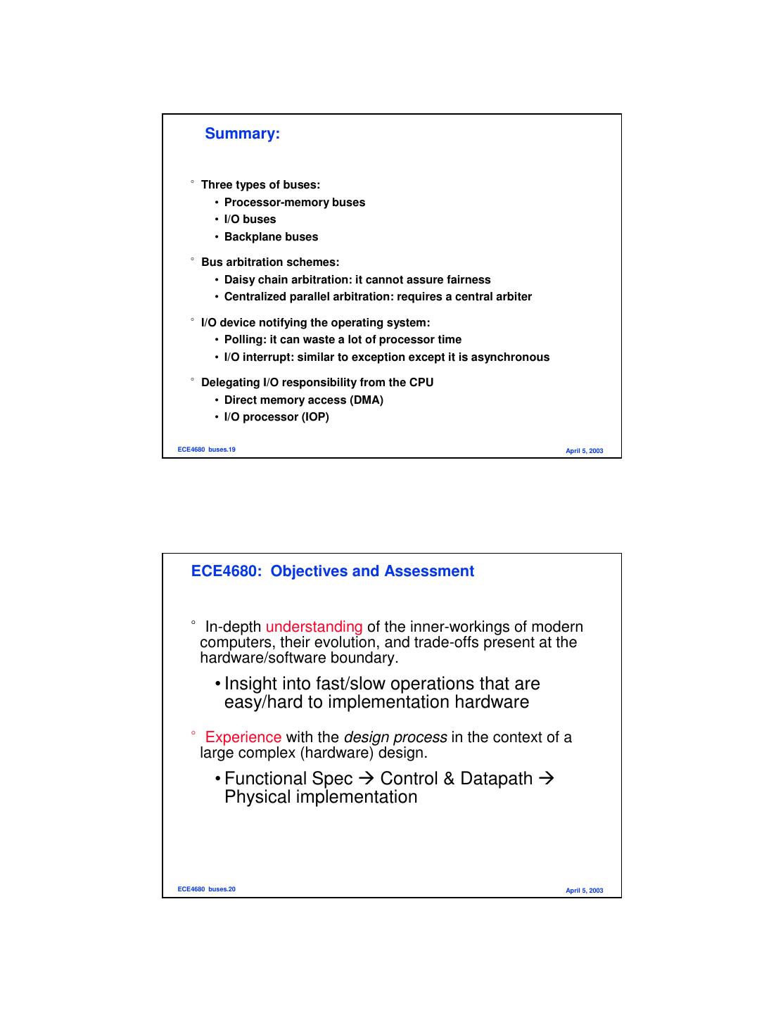 10 . Summary: °Three types of buses: • Processor-memory buses • I/O buses • Backplane buses °Bus arbitration schemes: • Daisy chain arbitration: it cannot assure fairness • Centralized parallel arbitration: requires a central arbiter °I/O device notifying the operating system: • Polling: it can waste a lot of processor time • I/O interrupt: similar to exception except it is asynchronous °Delegating I/O responsibility from the CPU • Direct memory access (DMA) • I/O processor (IOP) ECE4680 buses.19 April 5, 2003 ECE4680: Objectives and Assessment °In-depth understanding of the inner-workings of modern computers, their evolution, and trade-offs present at the hardware/software boundary. • Insight into fast/slow operations that are easy/hard to implementation hardware °Experience with the design process in the context of a large complex (hardware) design. • Functional Spec Control & Datapath Physical implementation ECE4680 buses.20 April 5, 2003