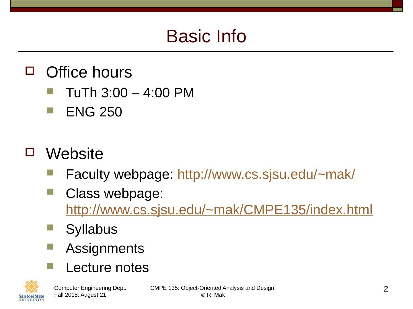 2 .Basic Info Office hours TuTh 3:00 – 4:00 PM ENG 250 Website Faculty webpage: http://www.cs.sjsu.edu/~mak/ Class webpage: http://www.cs.sjsu.edu/~mak/CMPE135/index.html Syllabus Assignments Lecture notes 2