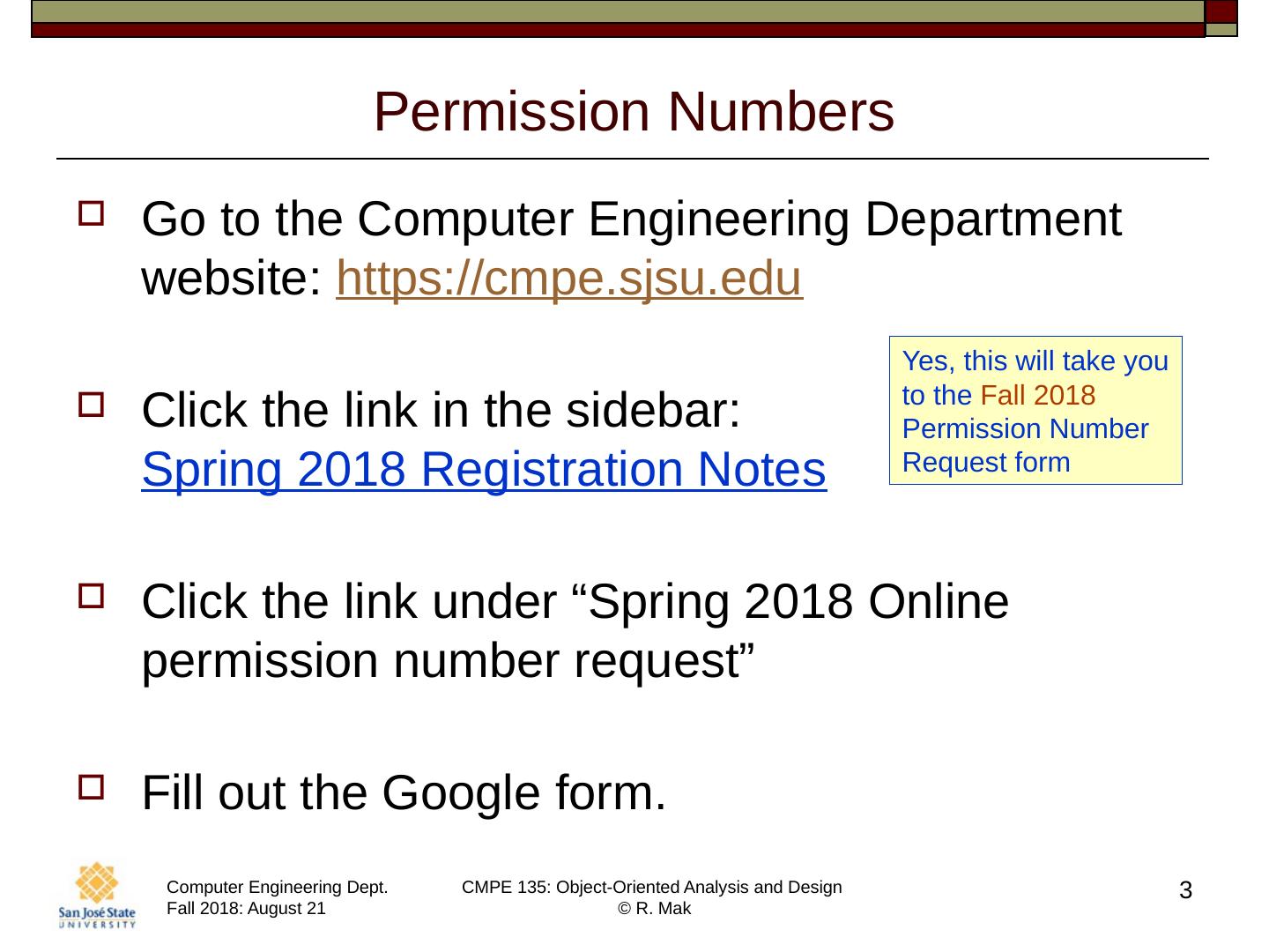 3 .Permission Numbers Go to the Computer Engineering Department website: https://cmpe.sjsu.edu Click the link in the sidebar: Spring 2018 Registration Notes Click the link under “Spring 2018 Online permission number request” Fill out the Google form. 3 Yes, this will take you to the Fall 2018 Permission Number Request form
