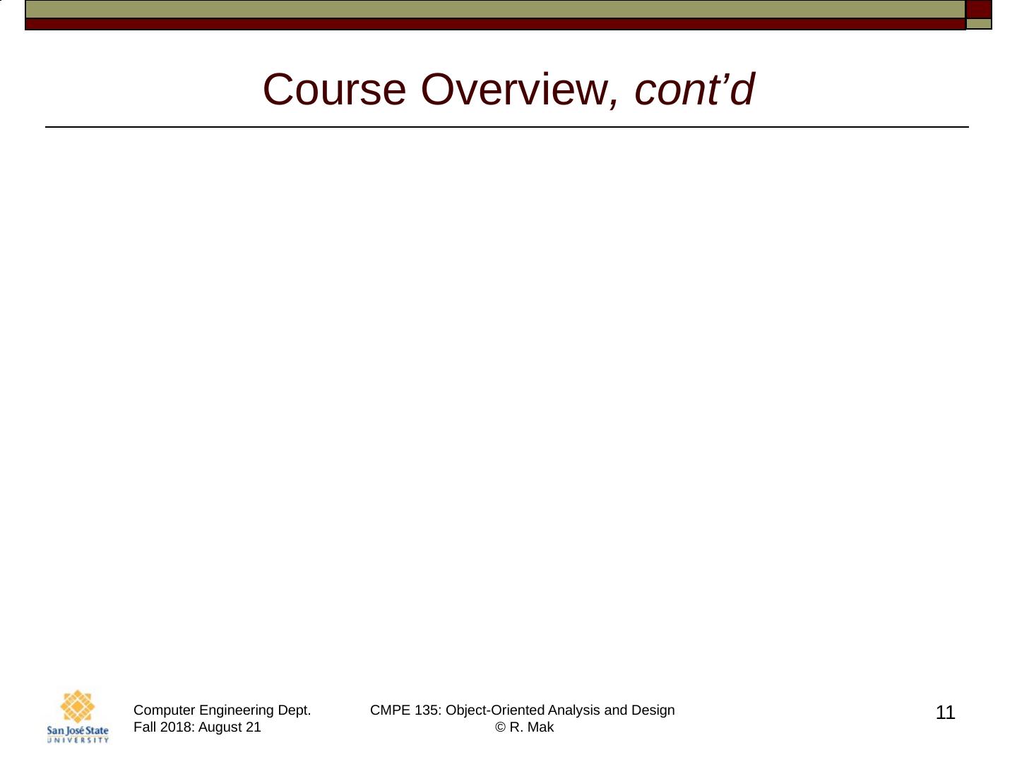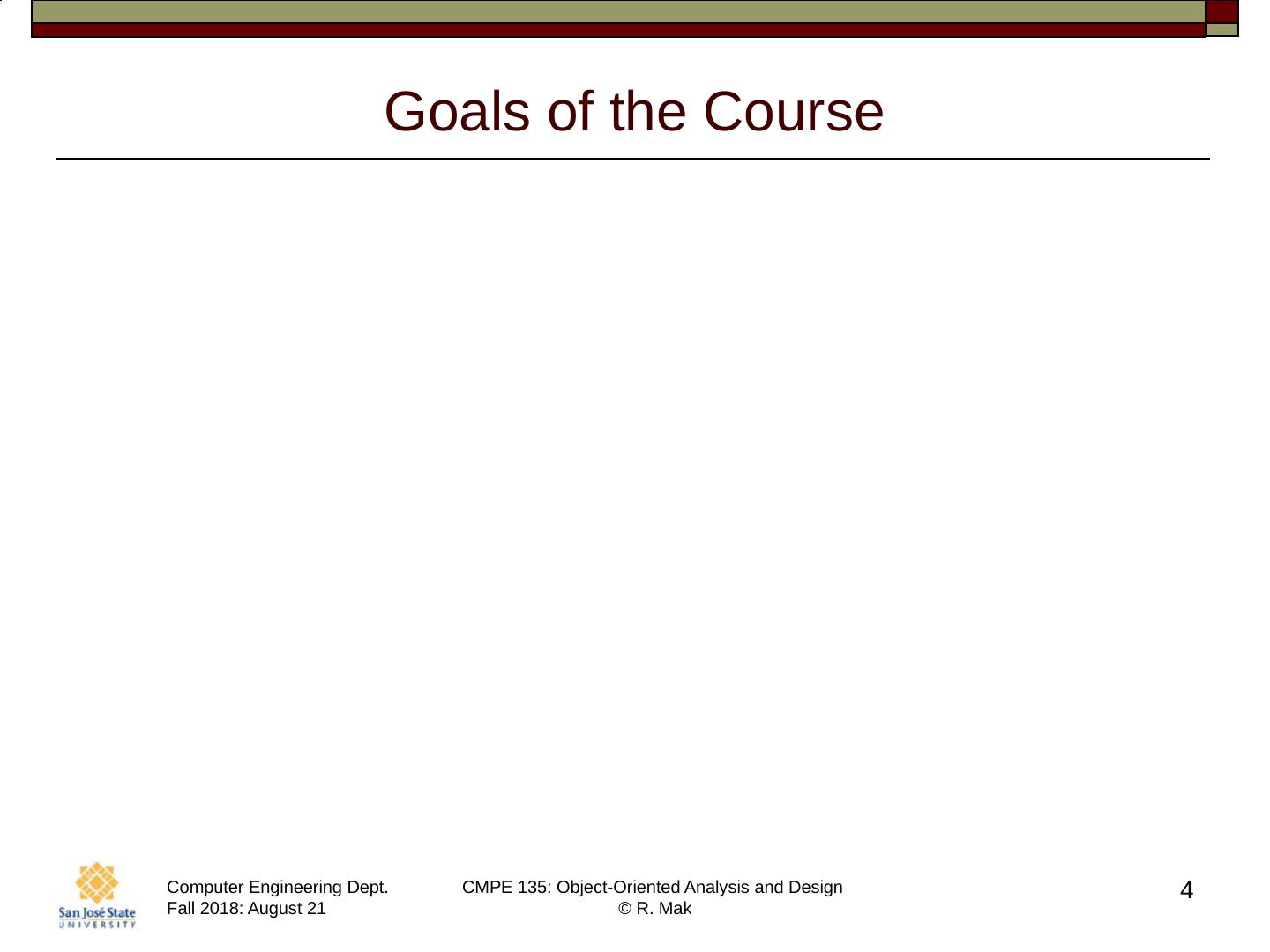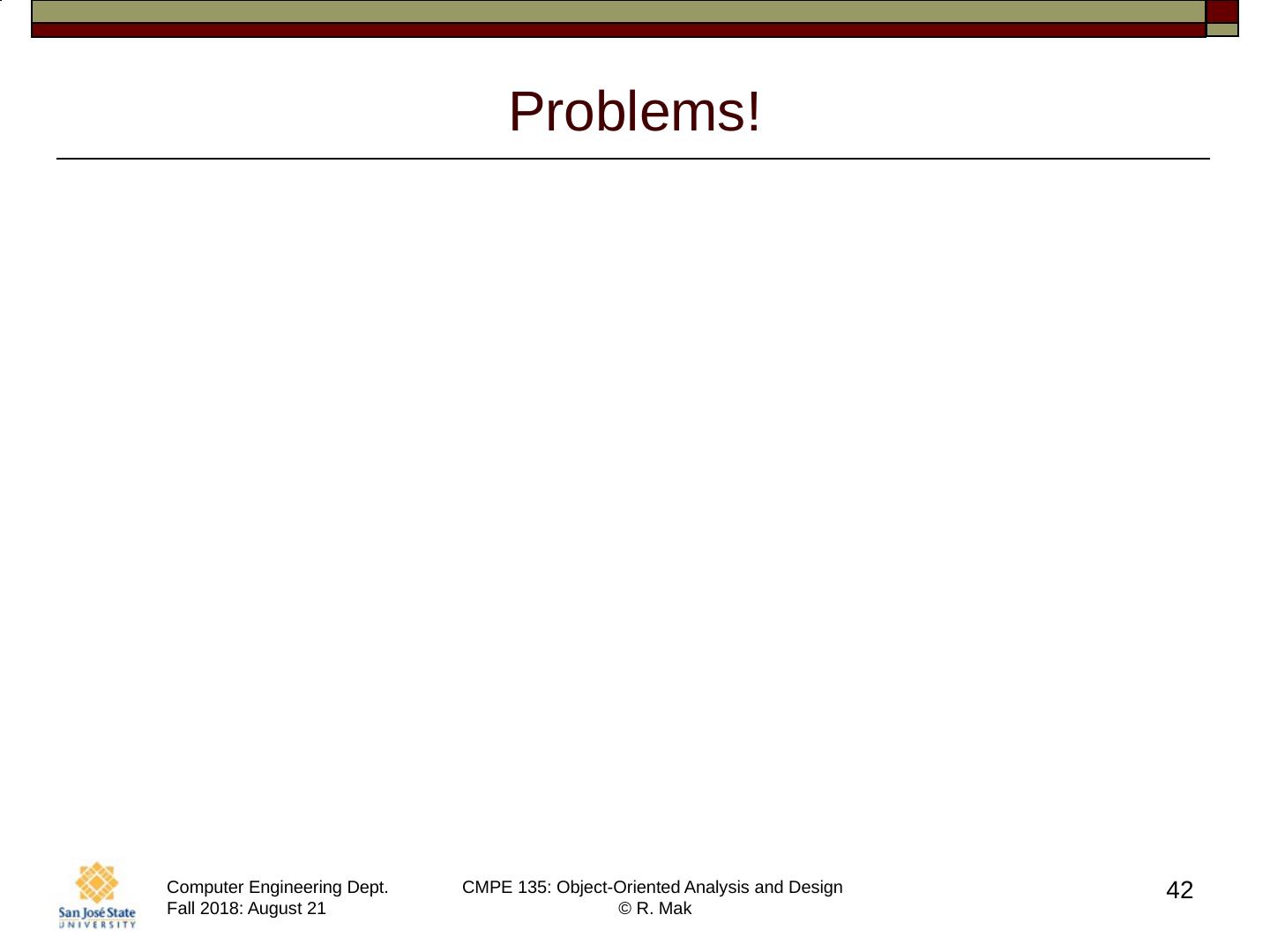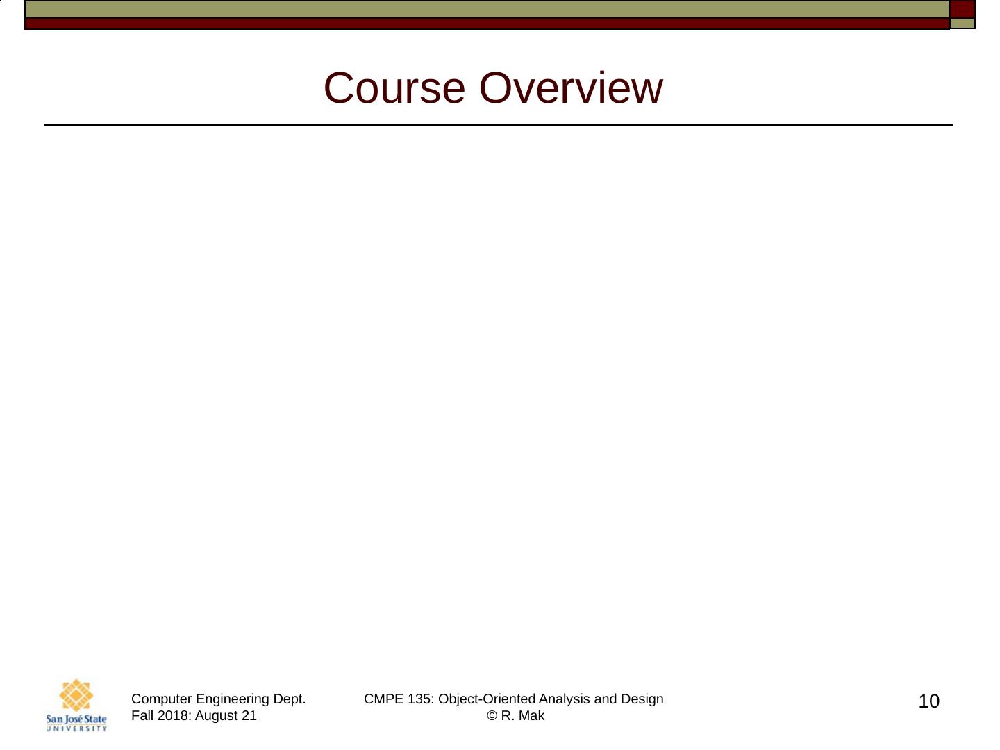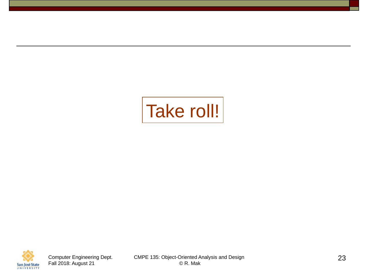 1 .CMPE 135 Object-Oriented Analysis and Design August 21 Class Meeting Department of Computer Engineering San Jose State University Fall 2018 Instructor: Ron Mak www.cs.sjsu.edu/~mak 1