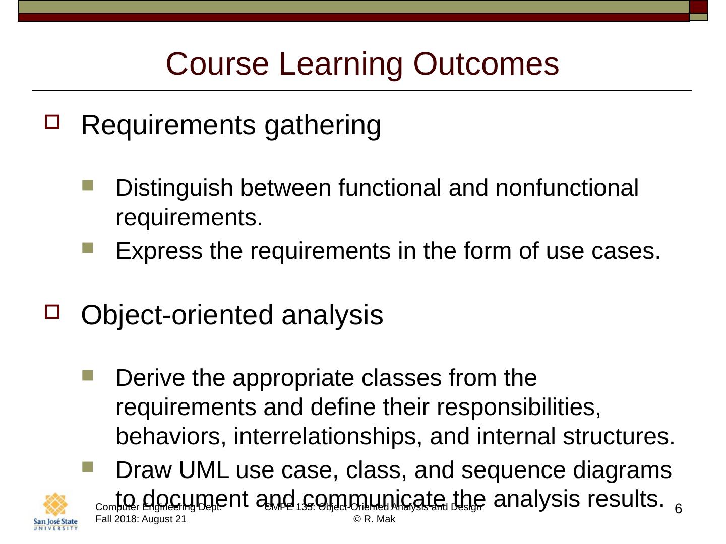 6 .Course Learning Outcomes Requirements gathering Distinguish between functional and nonfunctional requirements. Express the requirements in the form of use cases. Object-oriented analysis Derive the appropriate classes from the requirements and define their responsibilities, behaviors, interrelationships, and internal structures. Draw UML use case, class, and sequence diagrams to document and communicate the analysis results. 6