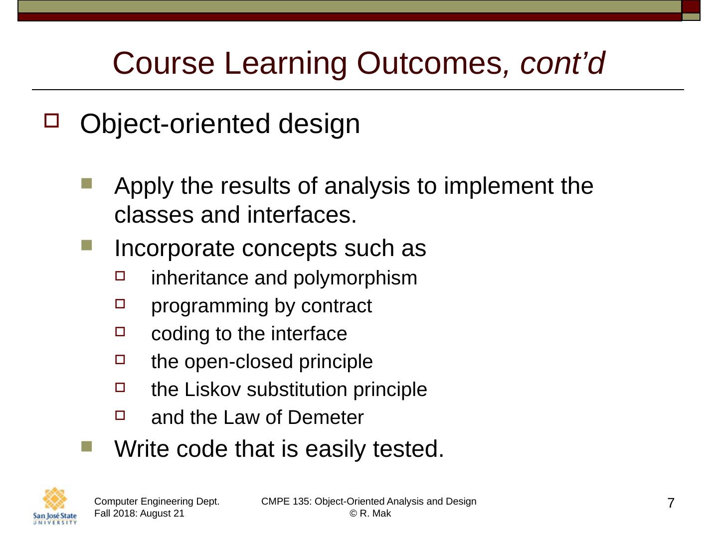 7 .Course Learning Outcomes , cont’d Object-oriented design Apply the results of analysis to implement the classes and interfaces. Incorporate concepts such as inheritance and polymorphism programming by contract coding to the interface the open-closed principle the Liskov substitution principle and the Law of Demeter Write code that is easily tested. 7