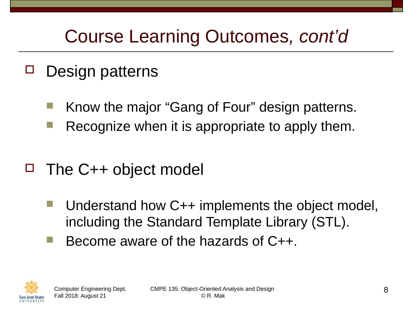 8 .Course Learning Outcomes , cont’d Design patterns Know the major “Gang of Four” design patterns. Recognize when it is appropriate to apply them. The C++ object model Understand how C++ implements the object model, including the Standard Template Library (STL). Become aware of the hazards of C++. 8
