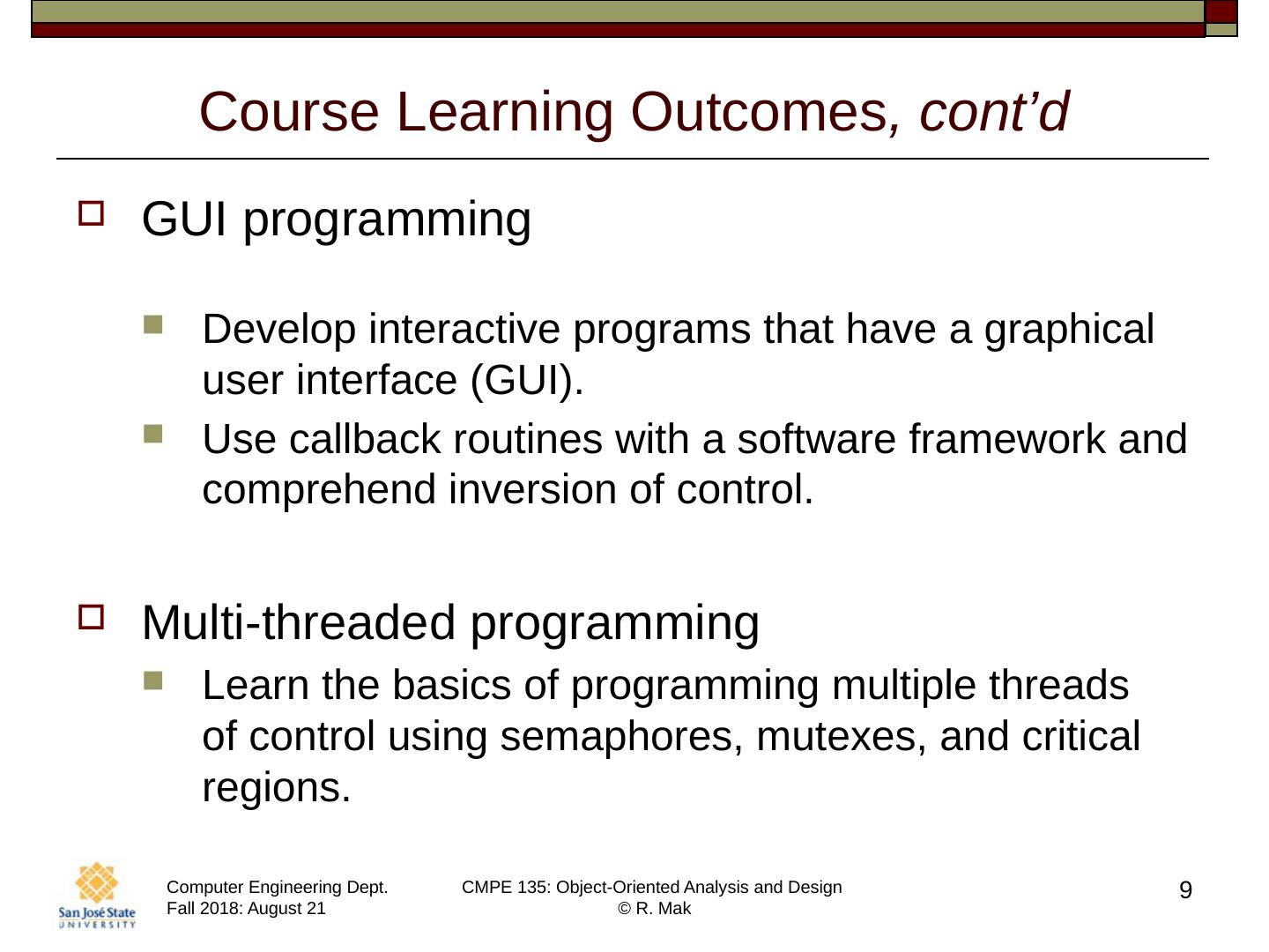 9 .Course Learning Outcomes , cont’d GUI programming Develop interactive programs that have a graphical user interface (GUI). Use callback routines with a software framework and comprehend inversion of control. Multi-threaded programming Learn the basics of programming multiple threads of control using semaphores, mutexes, and critical regions. 9