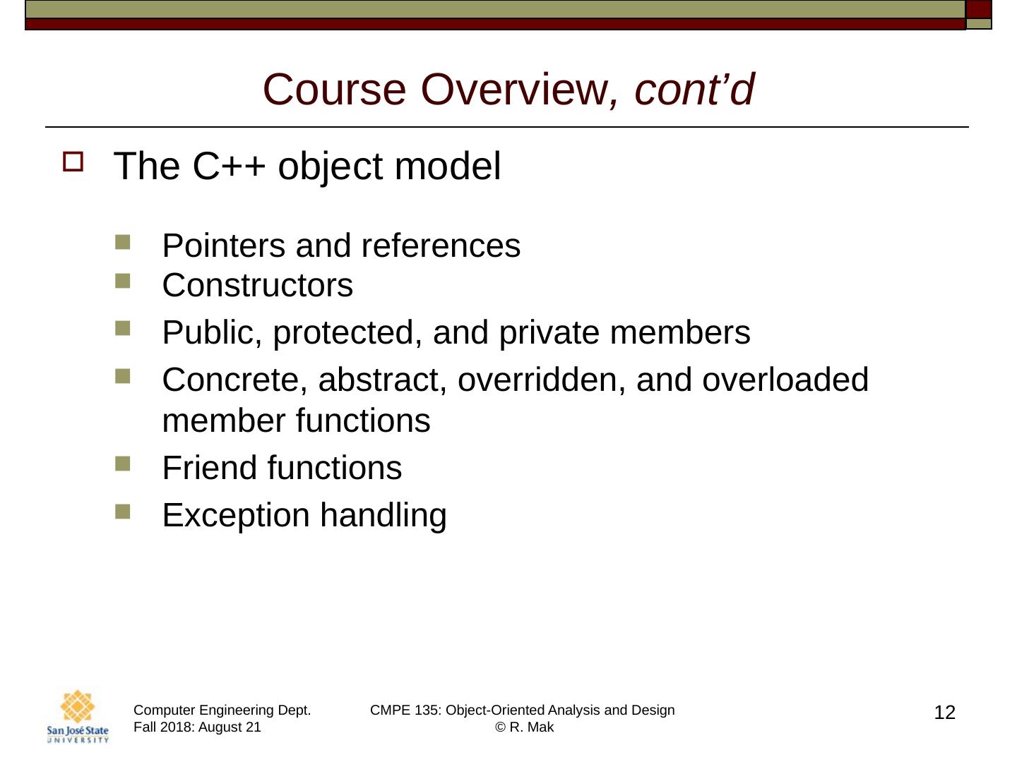 12 .Course Overview , cont’d The C++ object model Pointers and references Constructors Public, protected, and private members Concrete, abstract, overridden, and overloaded member functions Friend functions Exception handling 12