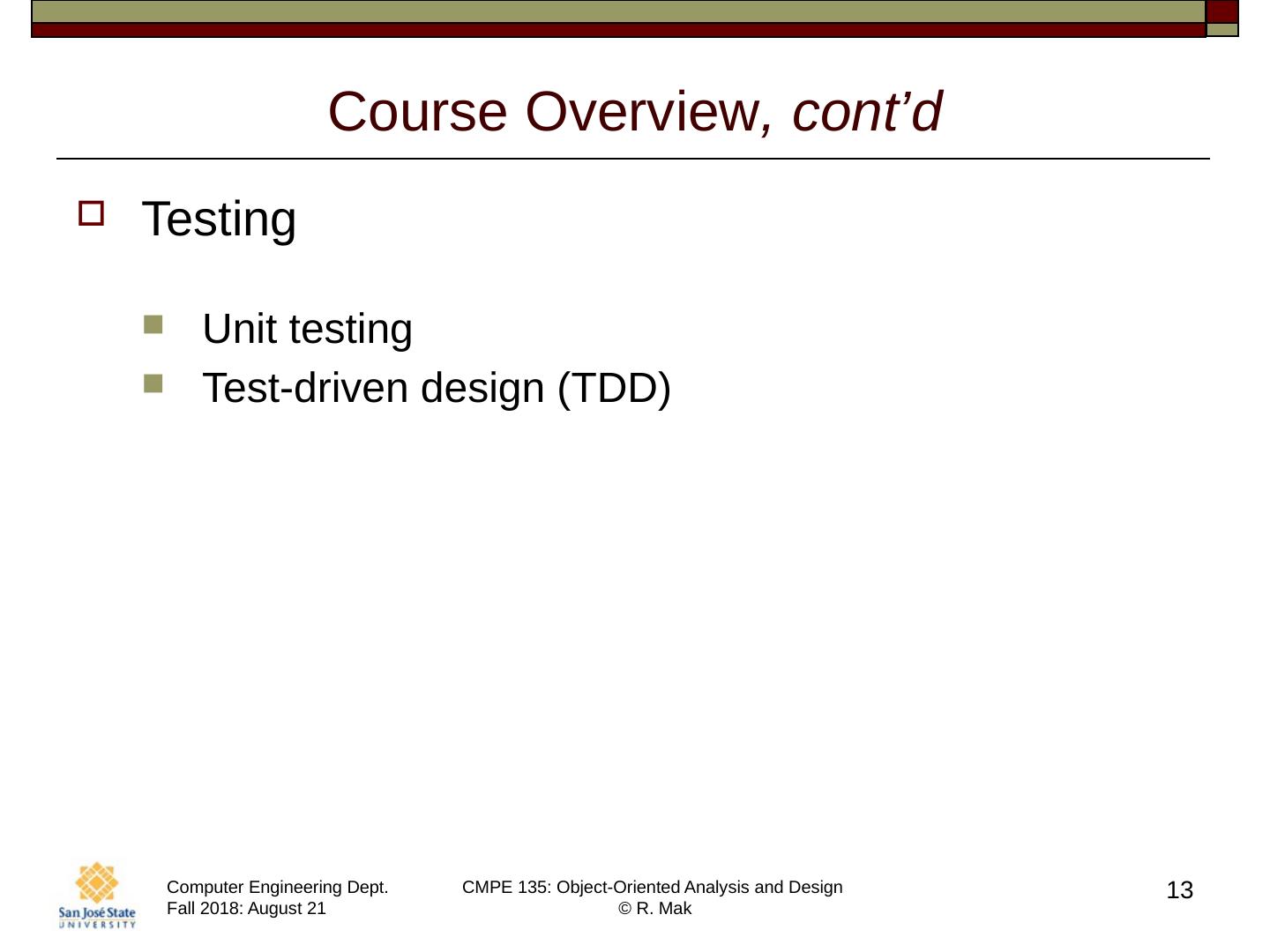 13 .Course Overview , cont’d Testing Unit testing Test-driven design (TDD) 13
