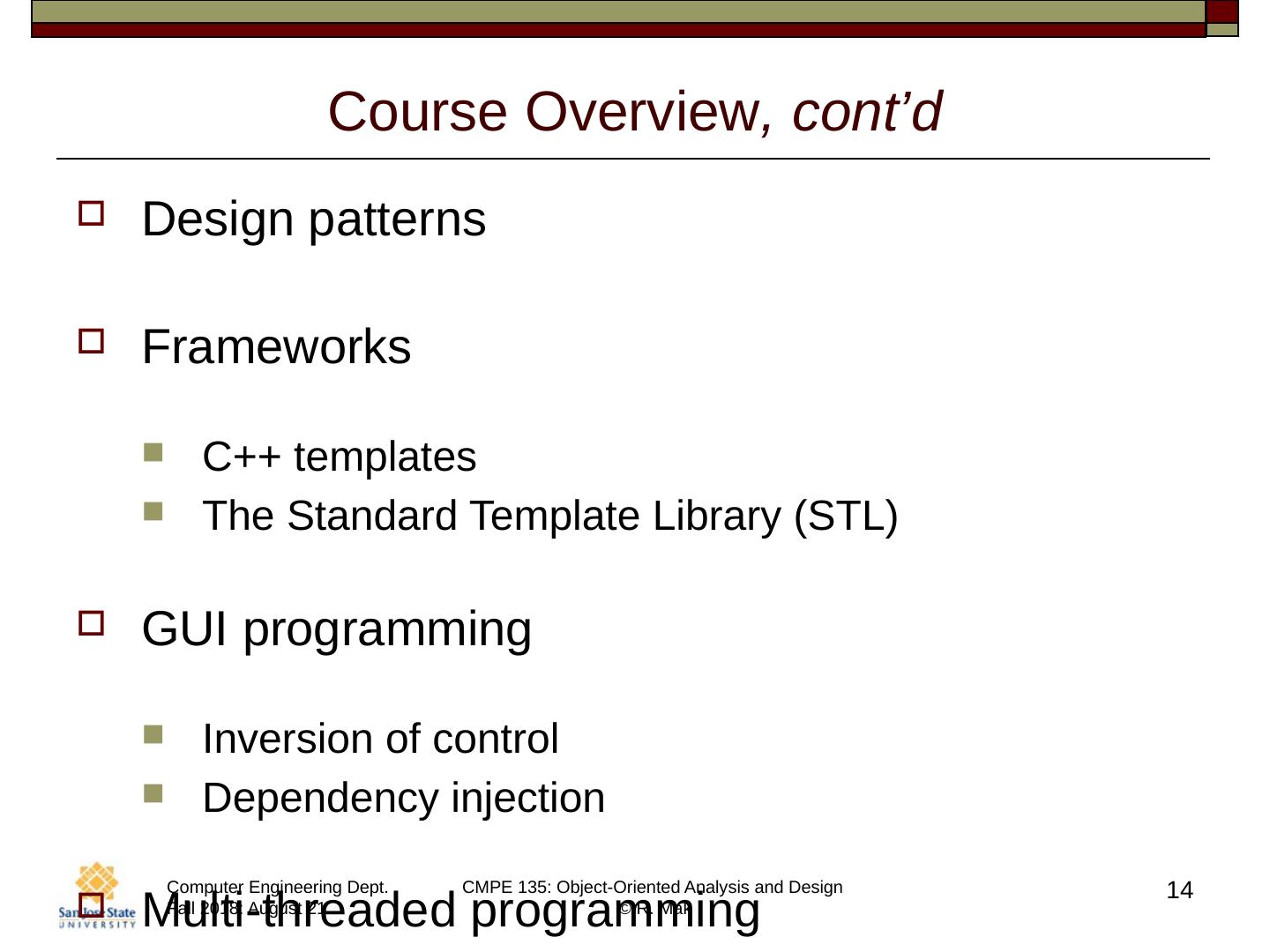 14 .Course Overview , cont’d Design patterns Frameworks C++ templates The Standard Template Library (STL) GUI programming Inversion of control Dependency injection Multi-threaded programming 14