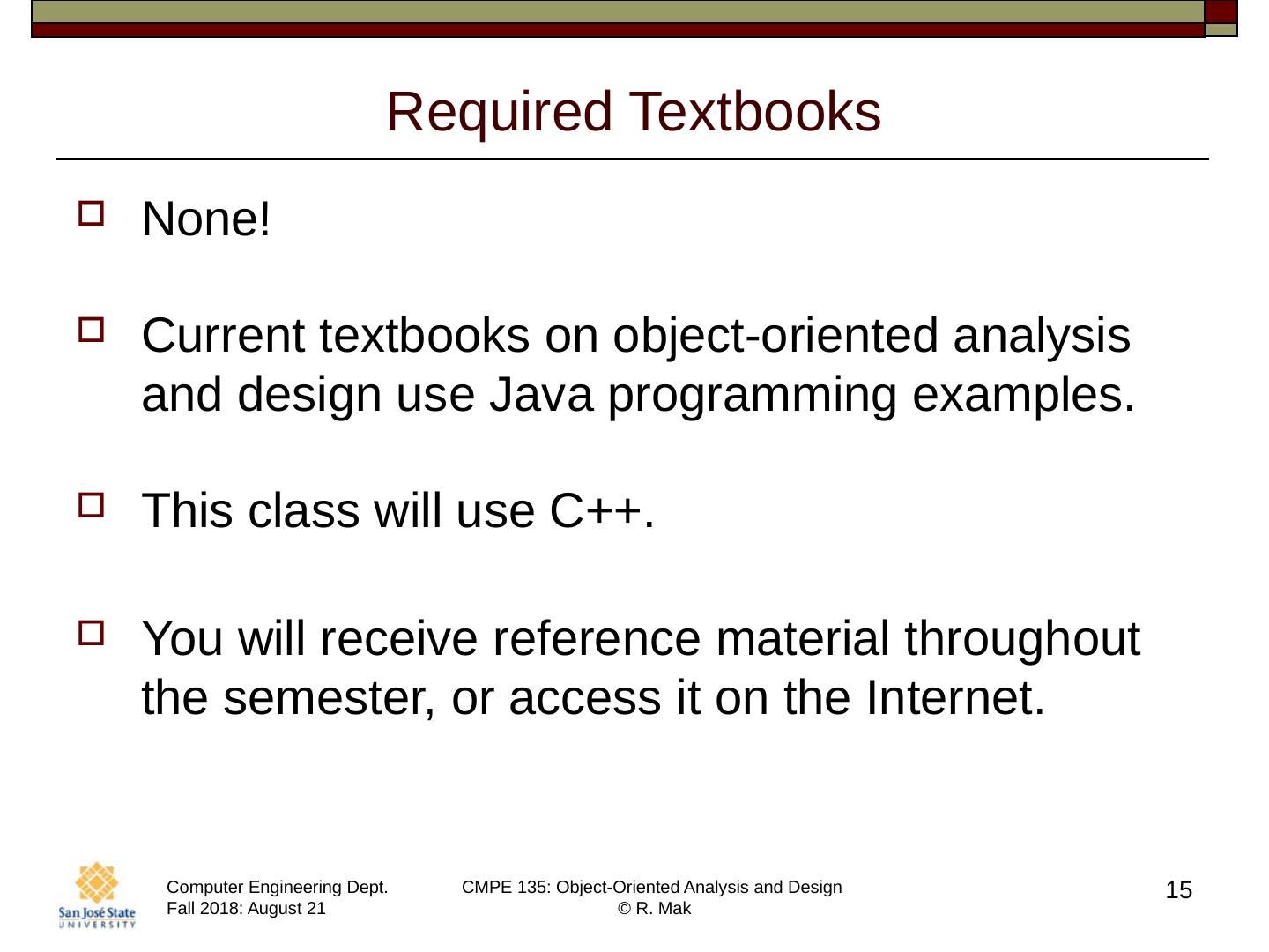 15 .Required Textbooks None! Current textbooks on object-oriented analysis and design use Java programming examples. This class will use C++. You will receive reference material throughout the semester, or access it on the Internet. 15
