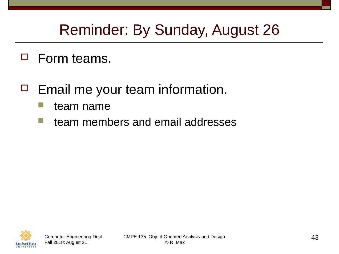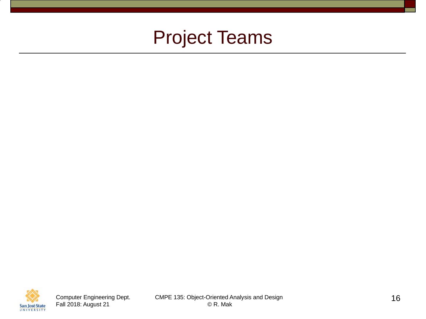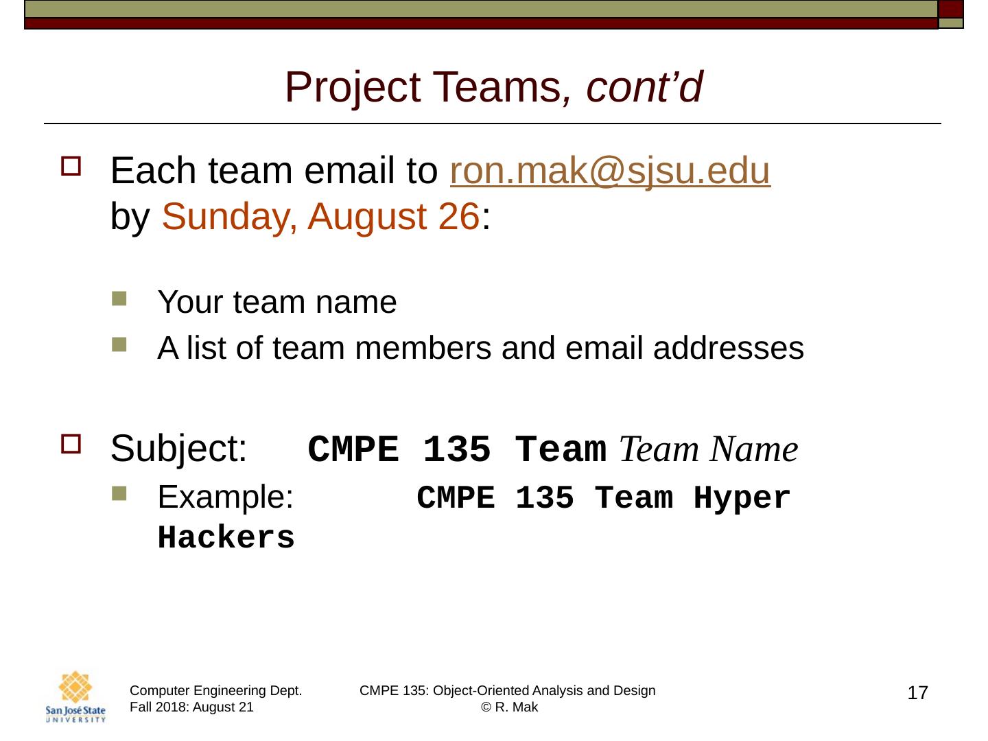 17 .Project Teams , cont’d Each team email to ron.mak@sjsu.edu by Sunday, August 26 : Your team name A list of team members and email addresses Subject: CMPE 135 Team Team Name Example: CMPE 135 Team Hyper Hackers 17