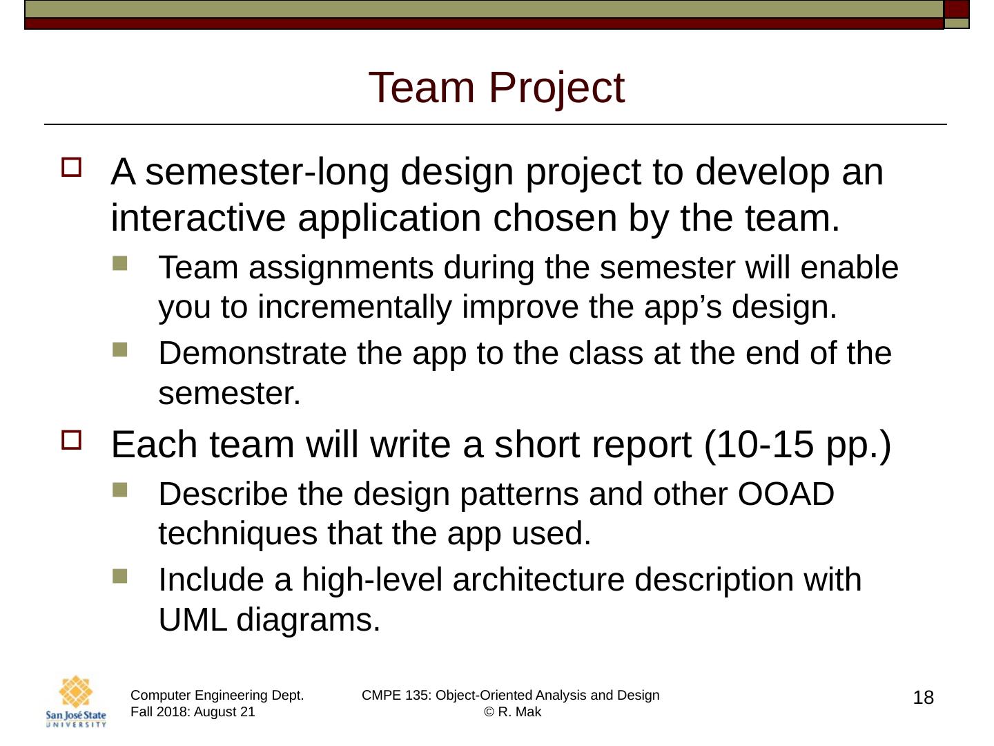 18 .Team Project A semester-long design project to develop an interactive application chosen by the team. Team assignments during the semester will enable you to incrementally improve the app’s design. Demonstrate the app to the class at the end of the semester. Each team will write a short report (10-15 pp.) Describe the design patterns and other OOAD techniques that the app used. Include a high-level architecture description with UML diagrams. 18