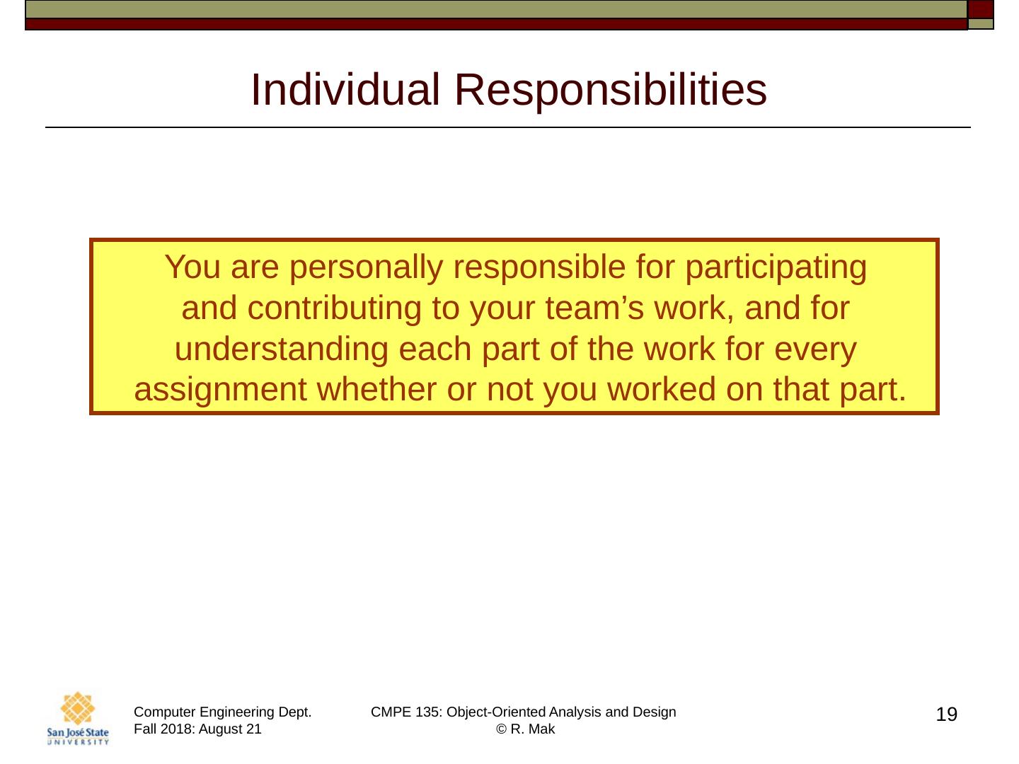 19 .19 Individual Responsibilities You are personally responsible for participating and contributing to your team ’ s work, and for understanding each part of the work for every assignment whether or not you worked on that part.