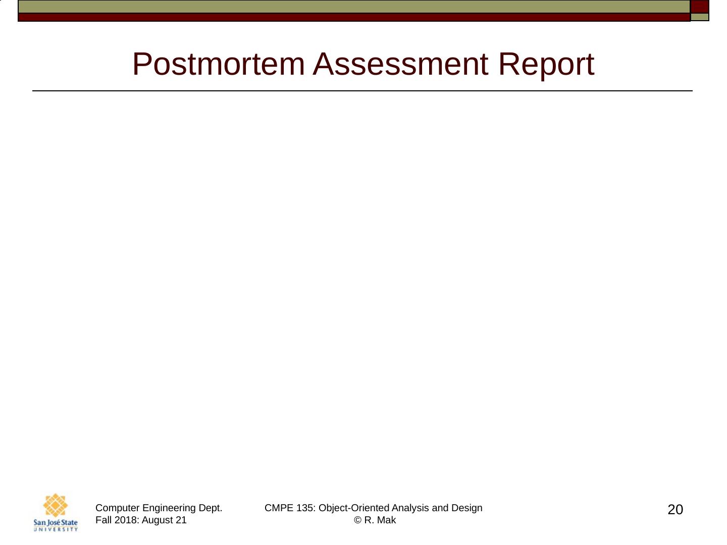 20 .20 Postmortem Assessment Report At the end of the semester, each student will individually turn in a short (one page) report: A brief description of what you learned in the course. An assessment of your personal accomplishments for your project team. An assessment of the contributions of each of your project team members . This report will be seen only by the instructor.