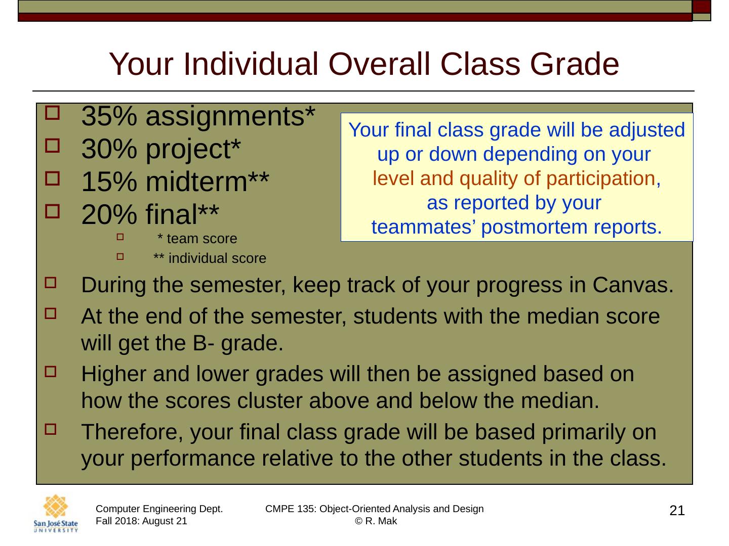 21 .21 Your Individual Overall Class Grade 35% assignments* 30% project* 15% midterm** 20% final** * team score ** individual score During the semester, keep track of your progress in Canvas. At the end of the semester, students with the median score will get the B- grade. Higher and lower grades will then be assigned based on how the scores cluster above and below the median. Therefore, your final class grade will be based primarily on your performance relative to the other students in the class. Your final class grade will be adjusted up or down depending on your level and quality of participation , as reported by your teammates ’ postmortem reports.