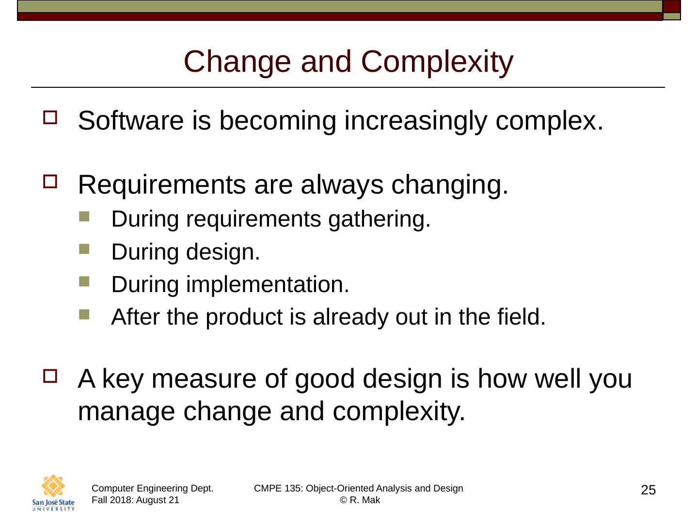 25 .Change and Complexity Software is becoming increasingly complex. Requirements are always changing. During requirements gathering. During design. During implementation. After the product is already out in the field. A key measure of good design is how well you manage change and complexity. 25
