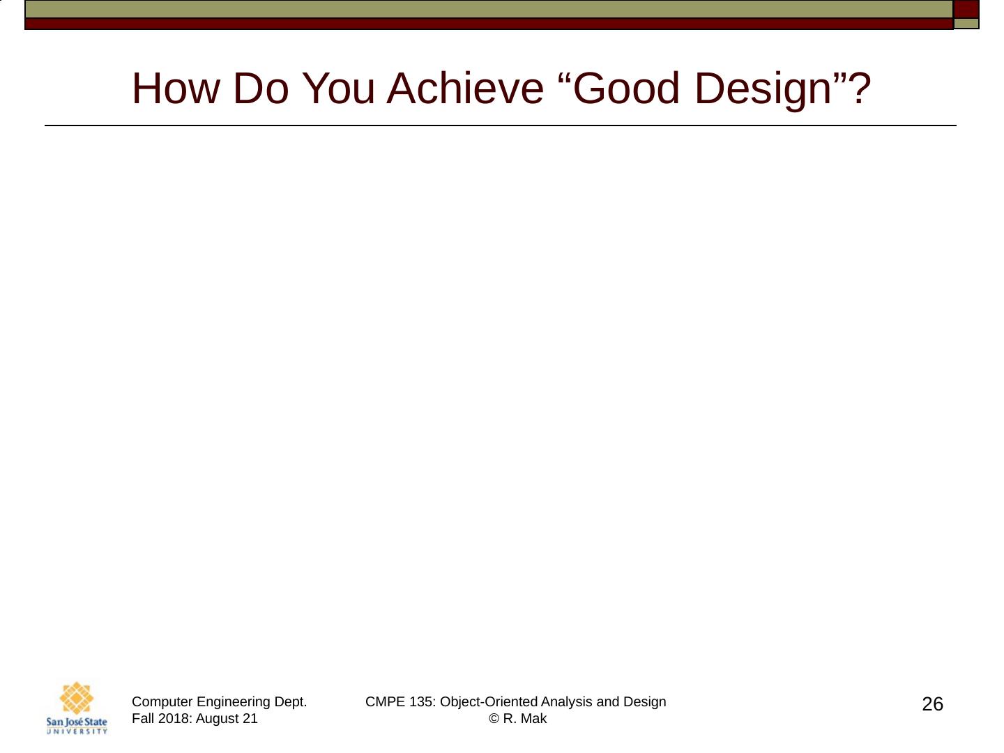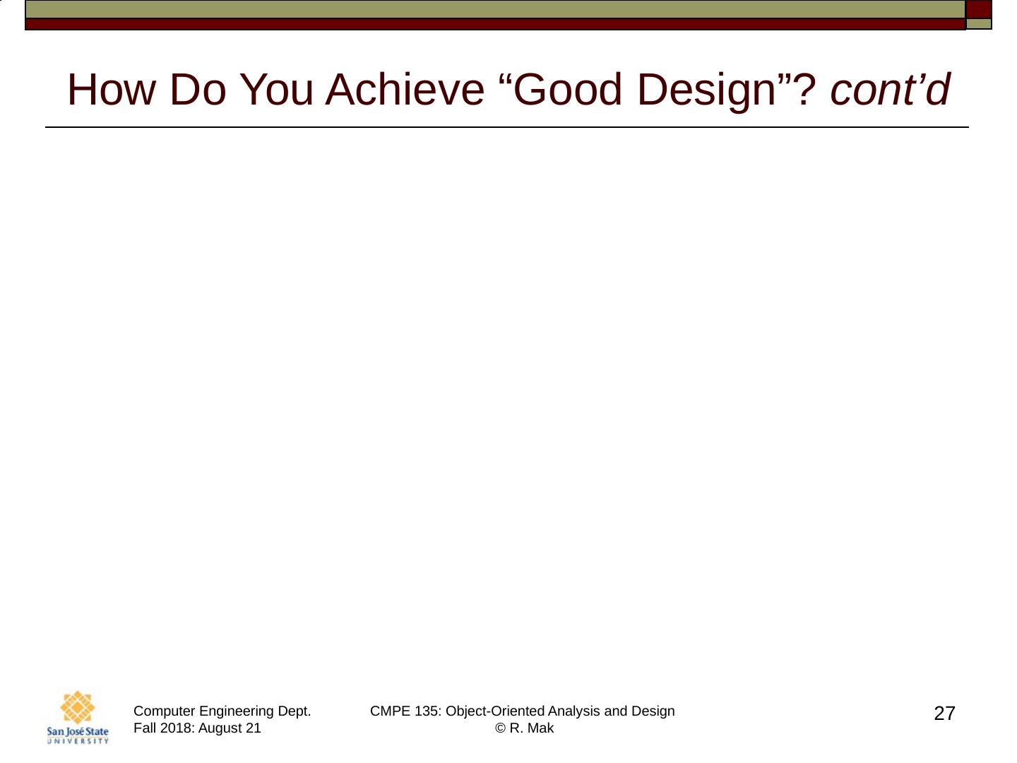 26 .26 How Do You Achieve “Good Design”? Sorry, there is no magic formula . Learning lots of object-oriented tools and techniques alone won’t give you good design. Just using design patterns won’t give you good design. For a nontrivial application, good design won’t simply “happen”.