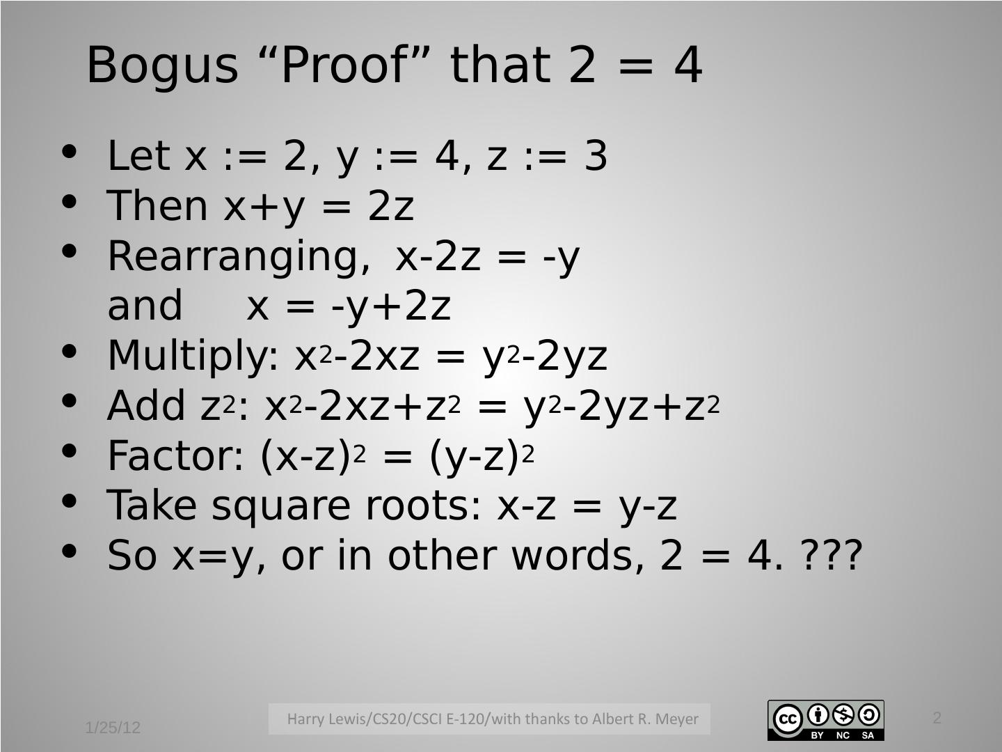2 . Bogus “Proof” that 2 = 4 Let x := 2, y := 4, z := 3 Then x+y = 2z Rearranging, x-2z = -y and x = -y+2z Multiply: x2-2xz = y2-2yz Add z2: x2-2xz+z2 = y2-2yz+z2 Factor: (x-z)2 = (y-z)2 Take square roots: x-z = y-z So x=y, or in other words, 2 = 4. ??? 2 1/25/12