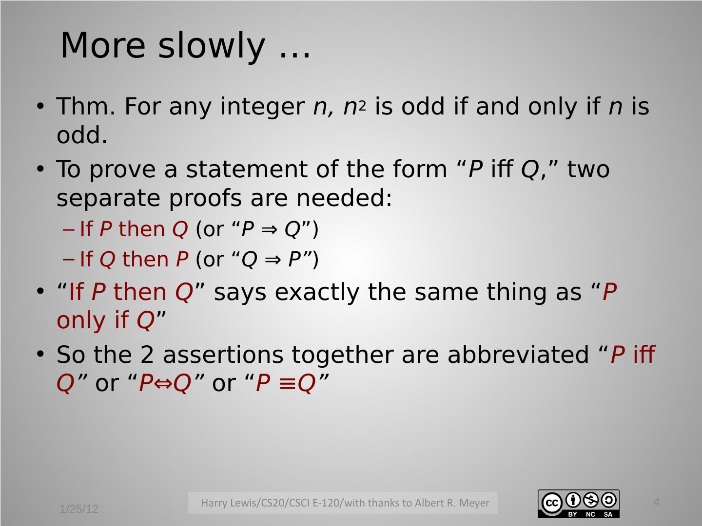 4 . More slowly … • Thm. For any integer n, n2 is odd if and only if n is odd. • To prove a statement of the form “P iff Q,” two separate proofs are needed: – If P then Q (or “P ⇒ Q”) – If Q then P (or “Q ⇒ P”) • “If P then Q” says exactly the same thing as “P only if Q” • So the 2 assertions together are abbreviated “P iff Q” or “P⇔Q” or “P ≡Q” 4 1/25/12