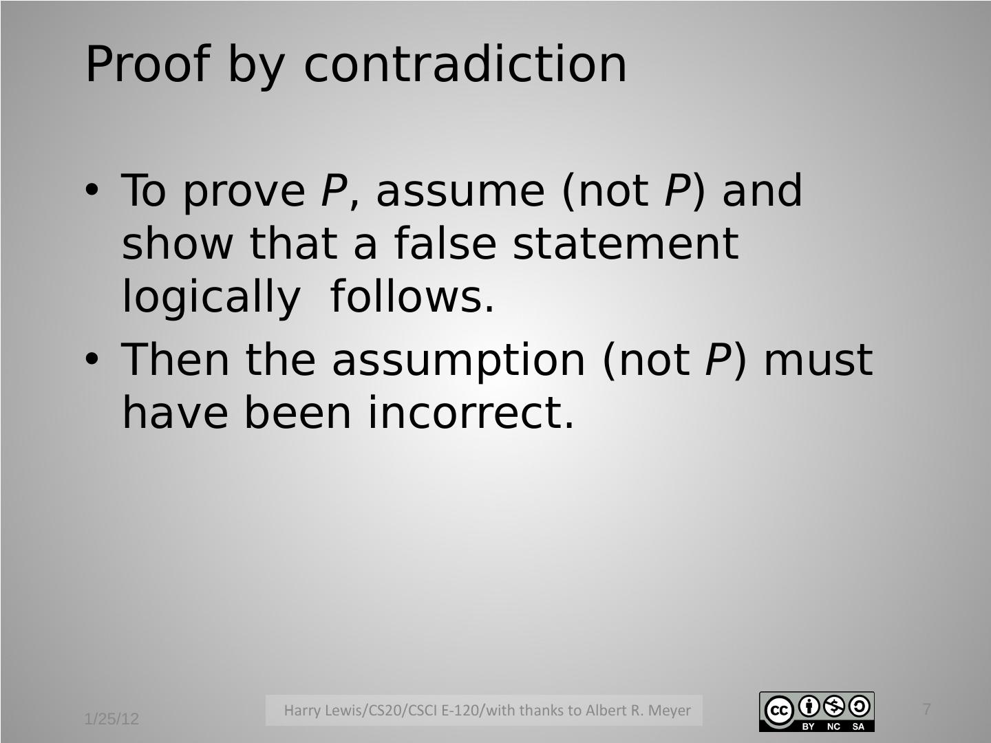 7 .Proof by contradiction • To prove P, assume (not P) and show that a false statement logically follows. • Then the assumption (not P) must have been incorrect. 7 1/25/12