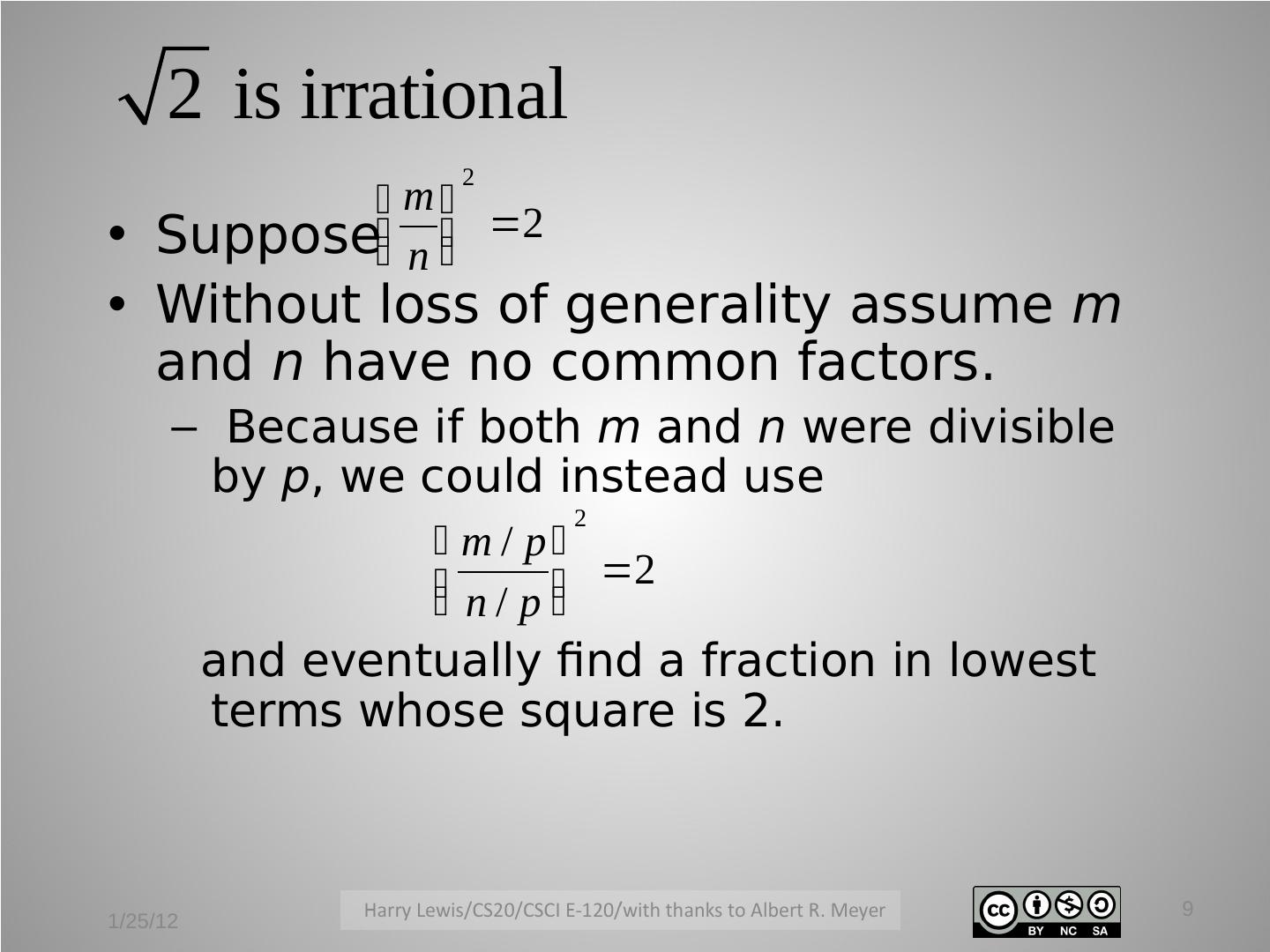 9 . 2 is irrational 2 m • Suppose n 2 • Without loss of generality assume m and n have no common factors. – Because if both m and n were divisible by p, we could instead use 2 m / p n / p 2 and eventually find a fraction in lowest terms whose square is 2. 9 1/25/12