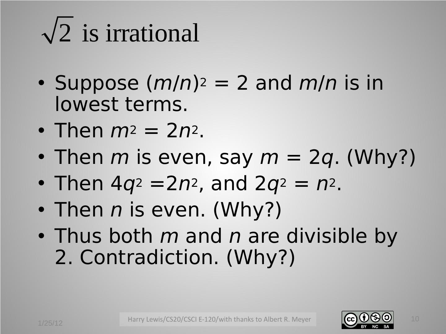 10 . 2 is irrational • Suppose (m/n)2 = 2 and m/n is in lowest terms. • Then m2 = 2n2. • Then m is even, say m = 2q. (Why?) • Then 4q2 =2n2, and 2q2 = n2. • Then n is even. (Why?) • Thus both m and n are divisible by 2. Contradiction. (Why?) 10 1/25/12