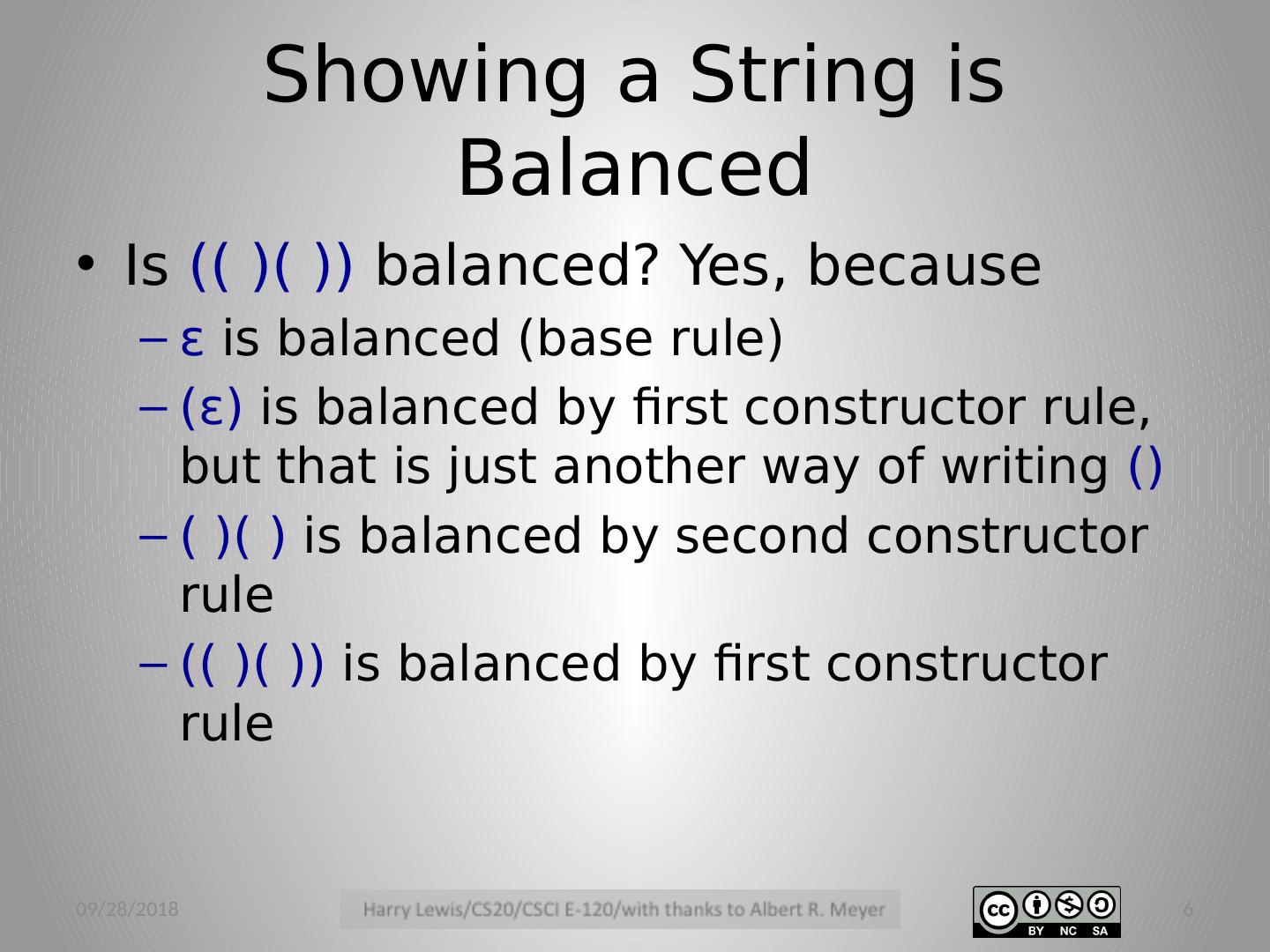 6 .Showing a String is Balanced Is ( ( )( ) ) balanced? Yes, because ε is balanced (base rule) ( ε ) is balanced by first constructor rule, but that is just another way of writing () ( )( ) is balanced by second constructor rule ( ( )( ) ) is balanced by first constructor rule 2/21/12 6