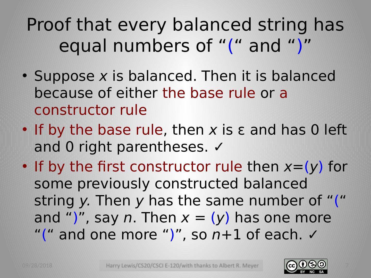 8 .Every balanced string has equal numbers of “(“ and “)” If by the second constructor rule then x = yz for some previously constructed balanced strings y and z . Then y has the same number of “ ( ” and “ ) ”, say n , and z has the same number of “ ( ” and “ ) ”, say m . Then x = yz has m + n “ ( ” and m + n “ ) ”. ✓ 2/21/12 8