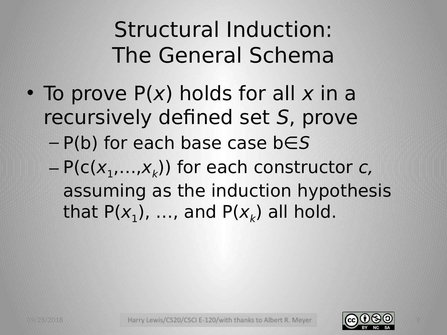 9 .Structural Induction: The General Schema To prove P( x ) holds for all x in a recursively defined set S , prove P(b ) for each base case b∈ S P(c( x 1 ,…, x k )) for each constructor c , assuming as the induction hypothesis that P( x 1 ), …, and P( x k ) all hold. 2/21/12 9