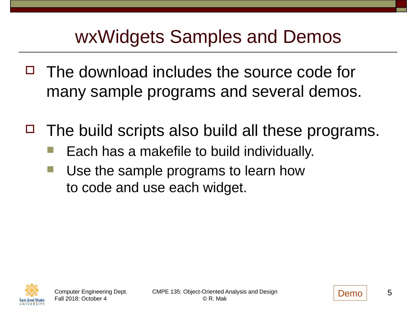 5 .wxWidgets Samples and Demos The download includes the source code for many sample programs and several demos. The build scripts also build all these programs. Each has a makefile to build individually. Use the sample programs to learn how to code and use each widget. 5 Demo