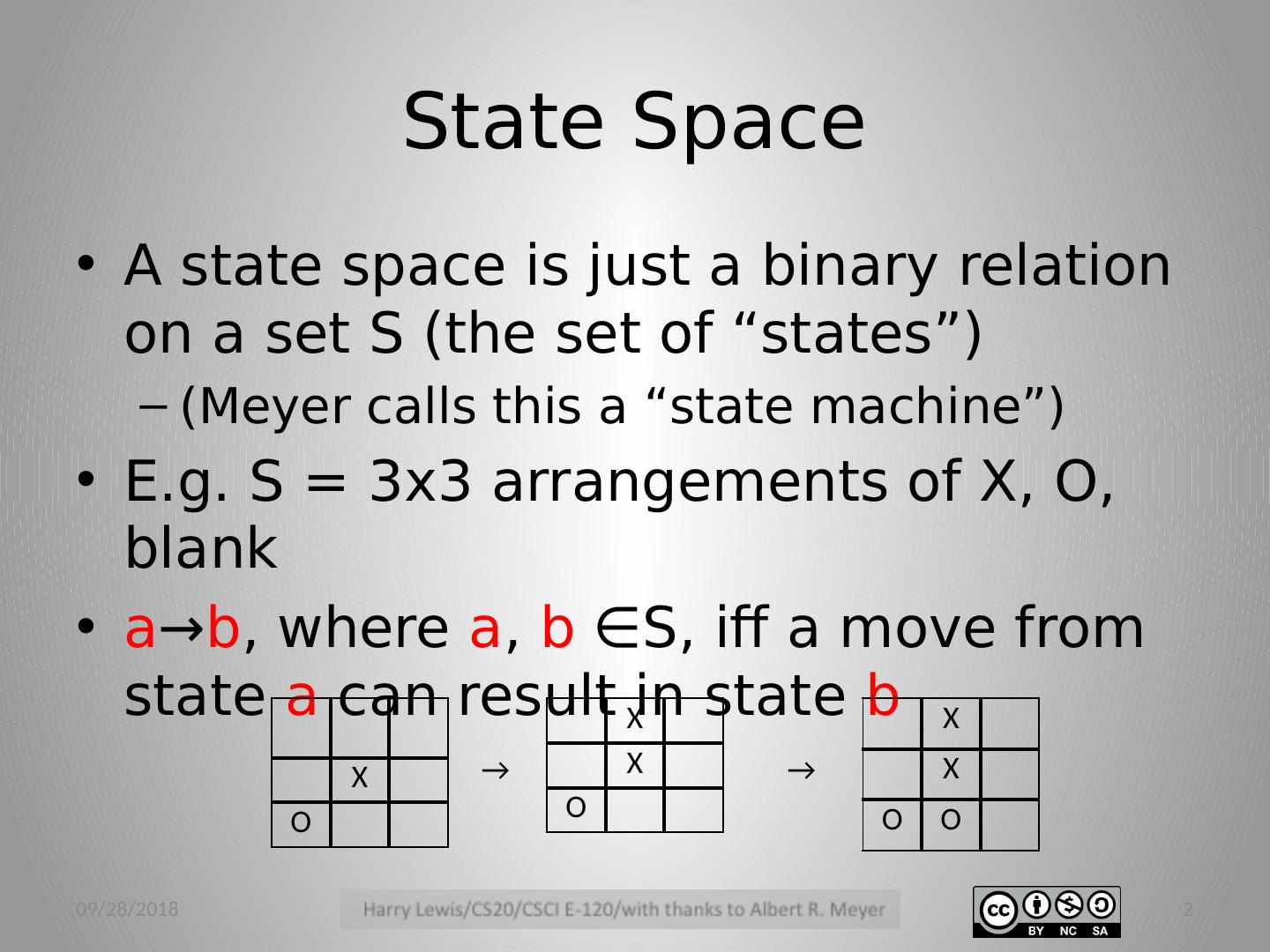 2 .State Space A state space is just a binary relation on a set S (the set of “states”) (Meyer calls this a “state machine”) E.g. S = 3x3 arrangements of X, O, blank a → b , where a , b ∈S, iff a move from state a can result in state b 3/2/12 2 X O X X O → → X X O O